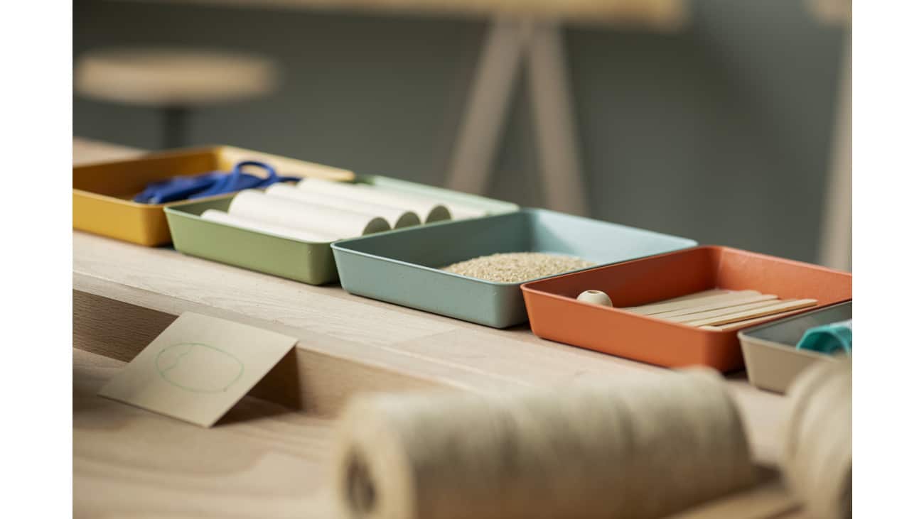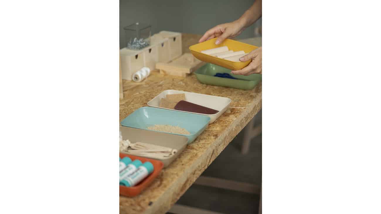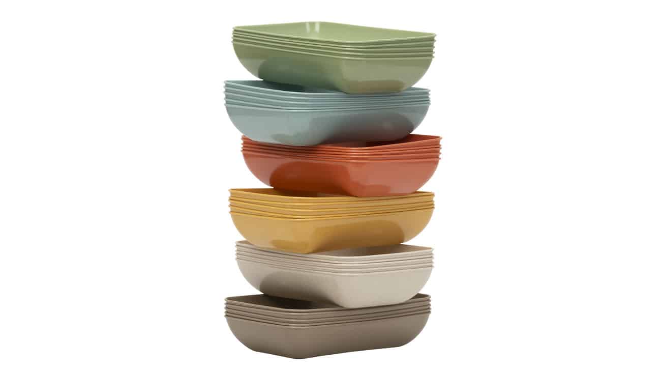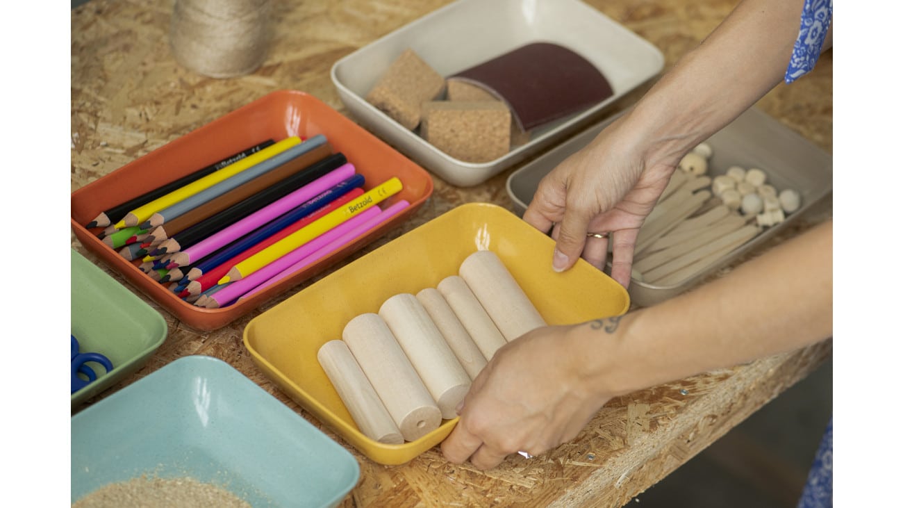 Mooie bio-based sorteerschalen in prachtig pastel kleuren, handig om te sorteren of te presenteren van loose parts materiaal.