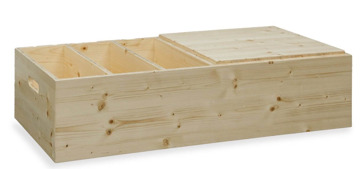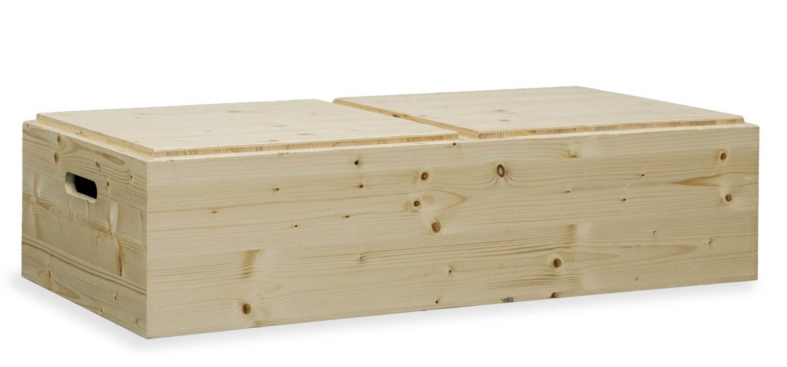 Ze kunnen worden gebruikt als zitplaats, opbergruimte of tafel. Maximaal drie boxen kunnen veilig op elkaar gestapeld worden. Drielaags massief vurenhout, 19 mm, stevig verlijmd, aan beide zijden gelakt en voorzien van vilten vloergeleiders.