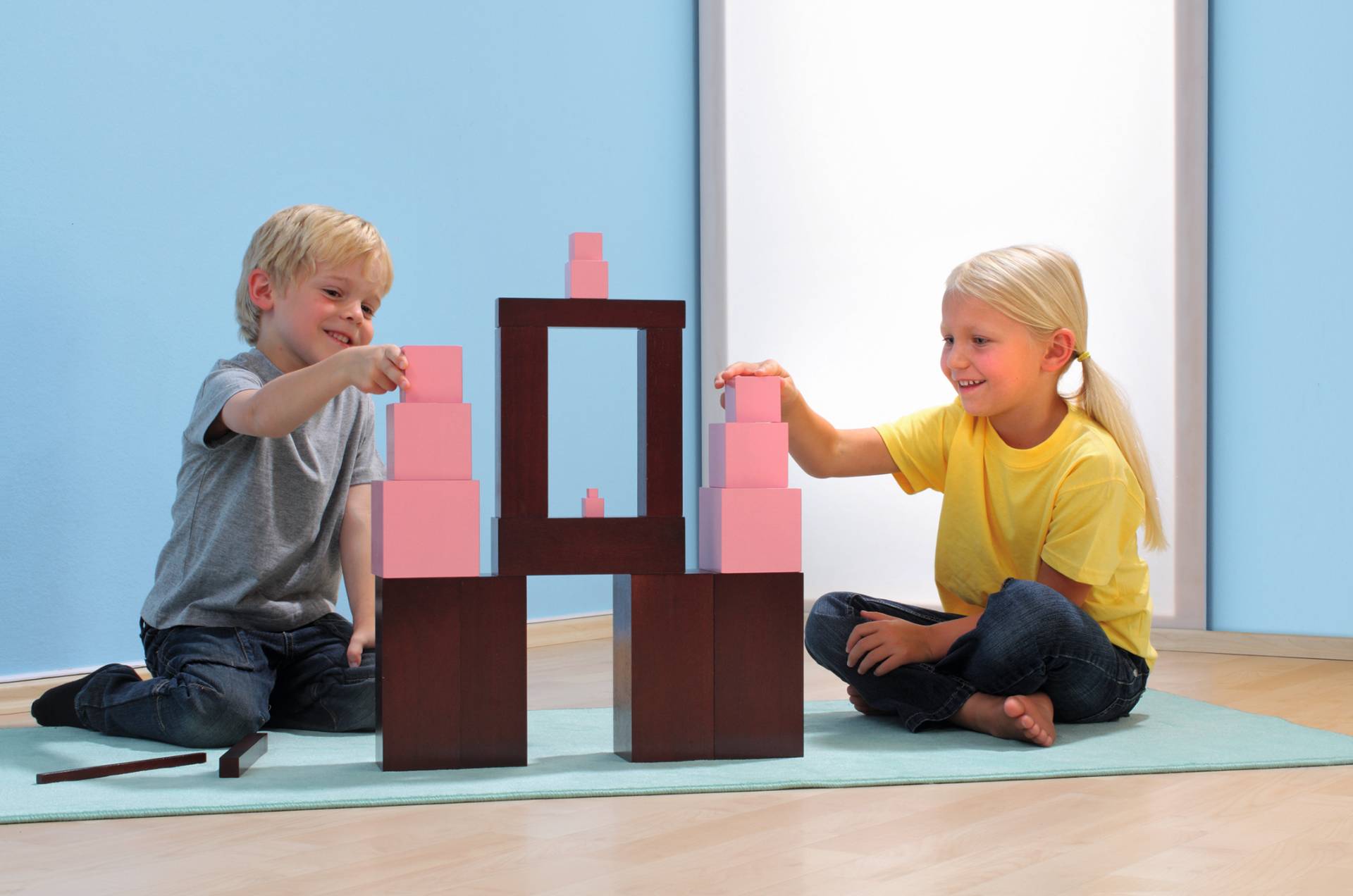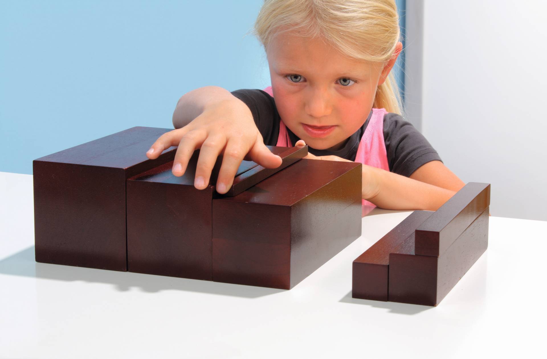 Deze bruine ’trap’ wordt vaak ingezet in het montessorionderwijs. Kinderen maken spelenderwijs kennis met maten en verhoudingen. De tien houten (rubberboom) blokken zijn elk 20 cm lang. Breedte en hoogte variĆ«ren elk met 1 cm. Op deze manier leren de kinderen over maatveranderingen in twee dimensies. Stimuleer de kinderen om zelfstandig te handelen en te denken en geef ze de ruimte om dingen uit te proberen. Leg bijvoorbeeld de 10 treden door elkaar heen op de grond en vraag je leerlingen om de treden in de juiste volgorde te leggen: van klein naar groot of andersom.