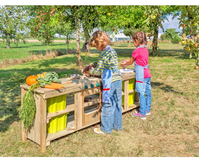 De buiten keuken XL biedt volop ruimte voor meerdere kinderen om tegelijk te spelen en te ontdekken. De robuuste constructie en natuurlijke uitstraling maken het een duurzame keuze voor buitenruimtes.
