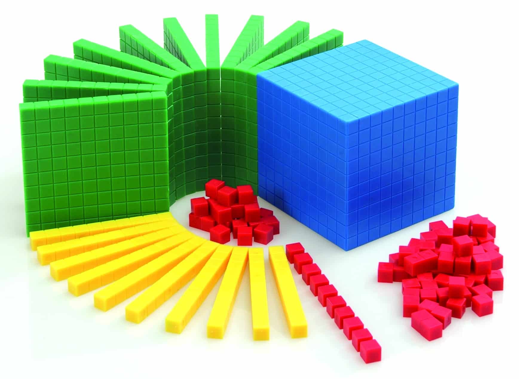 Systeembokken voor het decimaal stelsel, 1 doos (voor 4-5 leerlingen) heeft een inhoud van: 100 rode blokjes, 50 gele 10-stangen, 30 groene honderdplaten en 4 blauwe duizend kubussen.