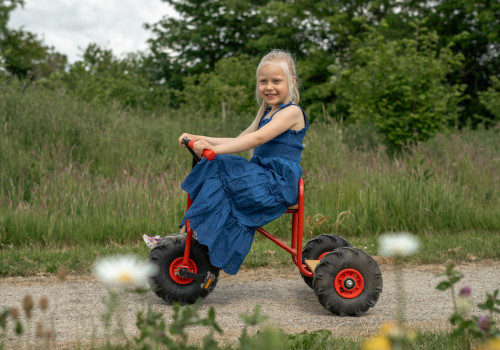 De ROSE kinderdriewieler met klein platform en tractorbanden helpt kinderen veilig leren rijden. Dankzij de trekhaak kan hij met een aanhanger worden gebruikt als speelse truck. Ideaal voor scholen, kinderdagverblijven en speelplaatsen. Geschikt voor kinderen van 4-10 jaar.