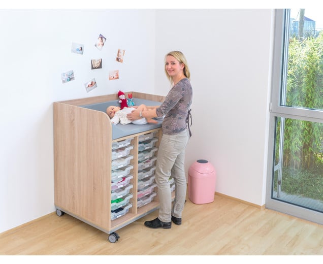 Flexeo-commode met 24 Gratnells laden van slagvast kunststof H/B 116×108,5cm in 2 dieptes 76 of 90cm diep. Inclusief passend aankleedkussen.