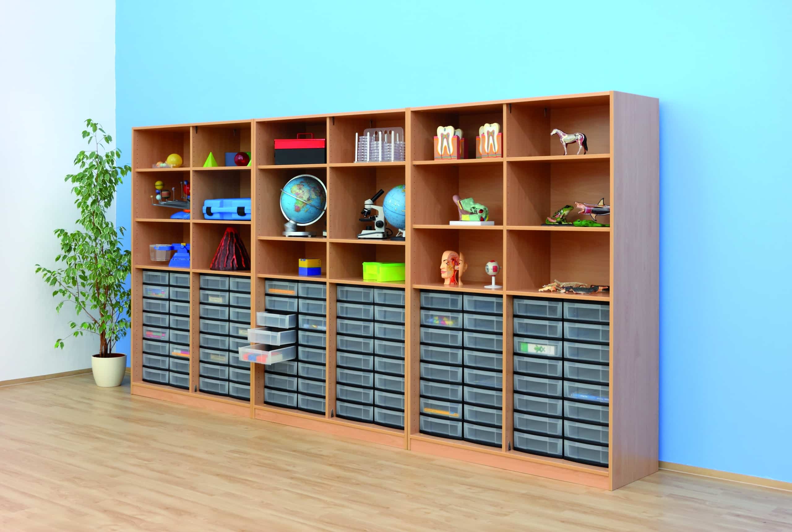 Extreem solide verlijmde en stabiele kastenwand speciaal voor scholen met maar liefst 18 open vakken om de leermiddelen een mooie zichtbare plek in het lokaal te geven en de leerlingen te stimuleren de leermiddelen te pakken en te gebruiken bij de geboden lesstof. Daarnaast kunt u kiezen uit 48 diepe lades of 96 smalle lades afhankelijk van uw materiaal. Deze mooie kastenwand geeft eenheid & rust in uw lokaal en is ideaal inzetbaar voor onder andere techniek, biologie, uiterlijke verzorging, etc.