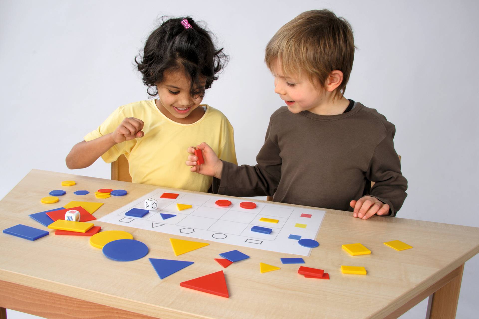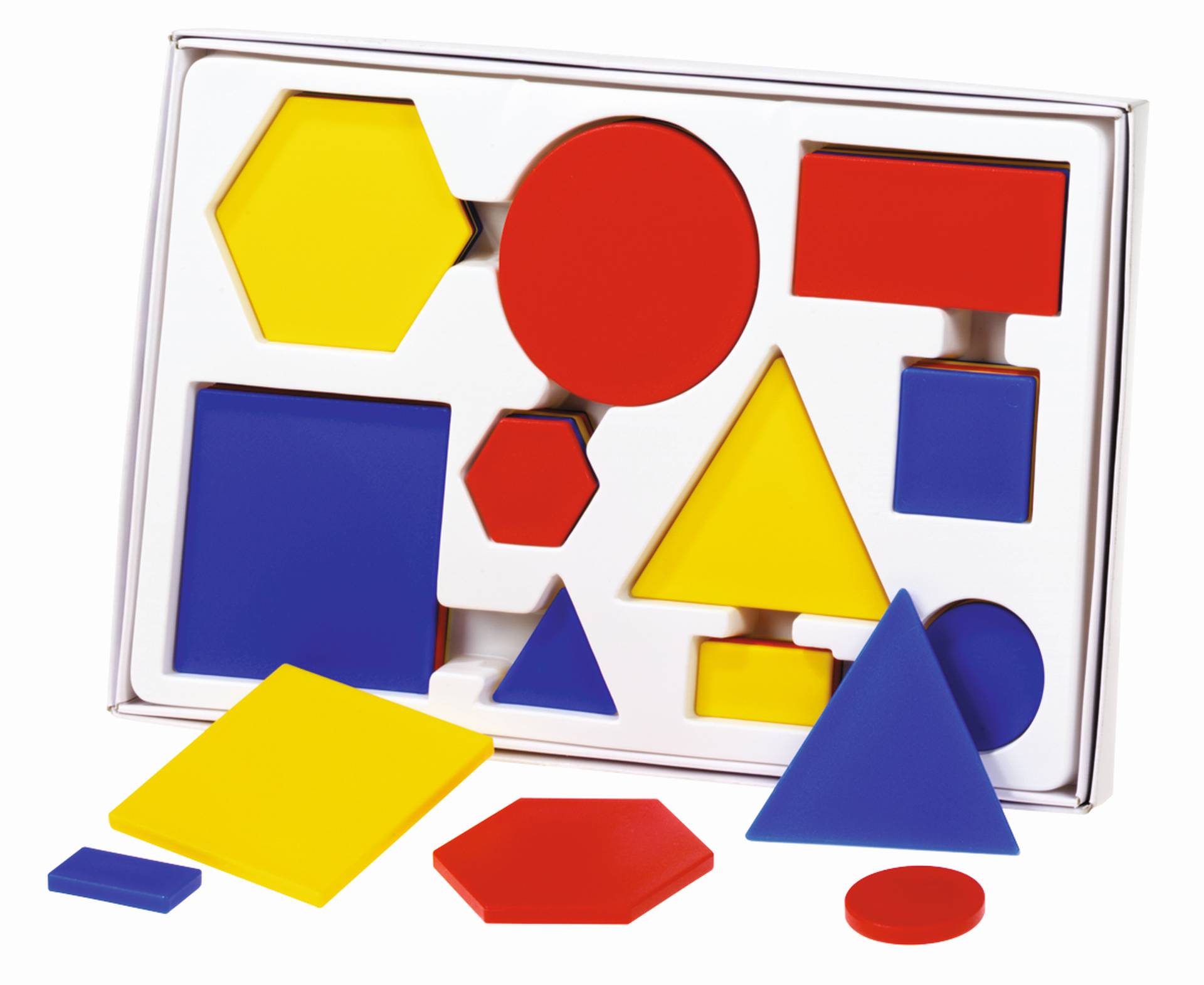Deze 60 geometrische vormen in 3 duidelijk kleuren rood, geel en blauw, en 5 verschillende vormen in 2 dikte maten zijn ideaal om te sorteren en classificeren.