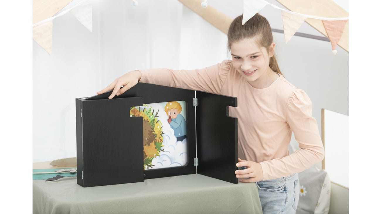 Dansende schaduwen, geïllustreerde verhalen of levende poppen: De combinatie kamishibai heeft 3 gebruiksmogelijkheden. Als je de kamishibai als verteltheater wilt gebruiken, schuif je gewoon de relevante kaart met de voorstelling er van bovenaf in en begin je geïnspireerd en met je eigen unieke interpretatie het verhaal van de afbeeldingen te vertellen. Je kunt de kamishibai als schaduwtheater gebruiken door de plaatjes te vervangen door het meegeleverde acrylglas. Met een geschikte lichtbron erachter creëer je in een handomdraai schaduwen. Als je de rail van de combinatiekamishibai leeg laat, wordt het een poppenkast met handpoppen of marionetten. Je kunt deze opdrachten ook aan het jonge publiek geven.