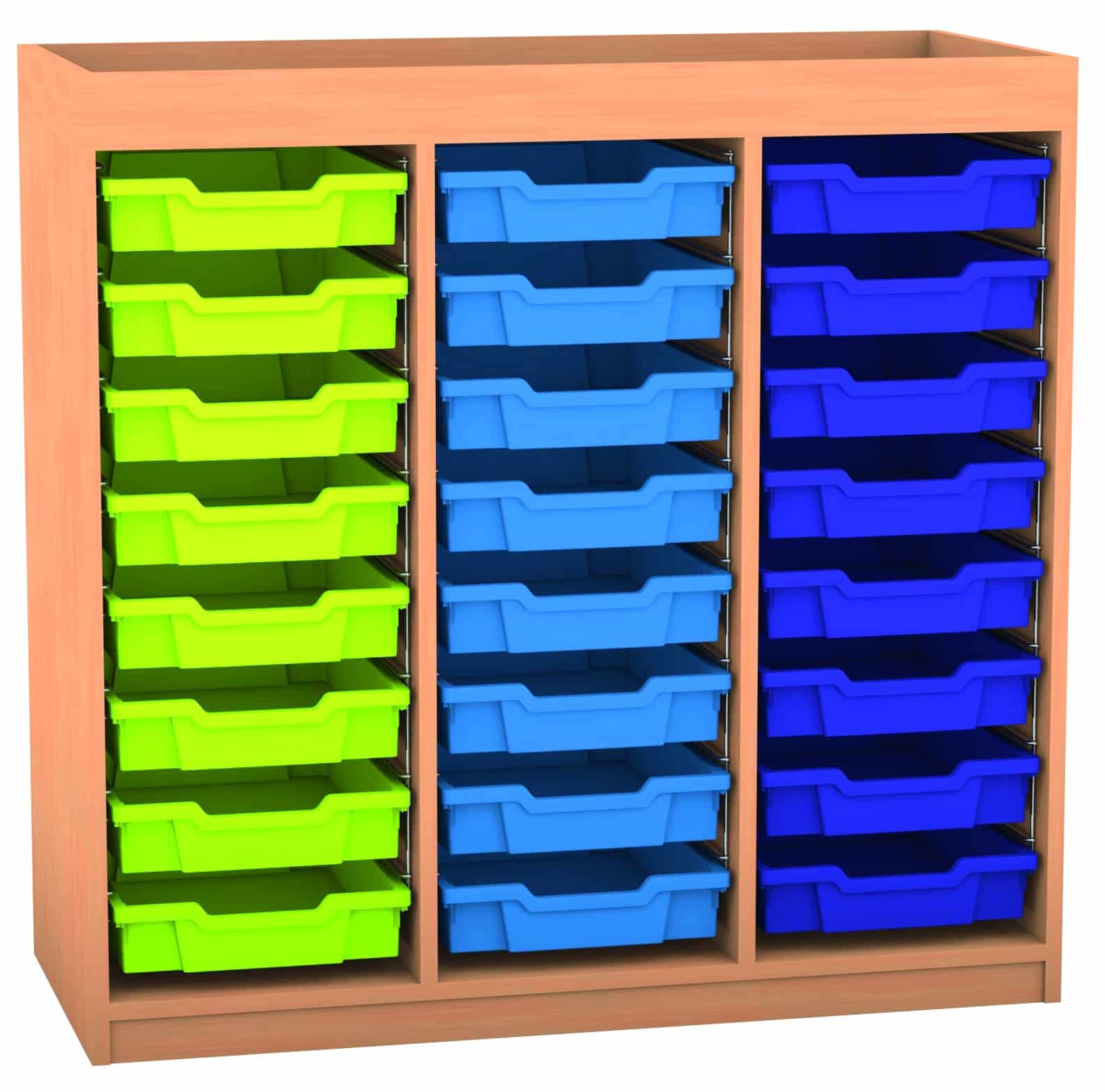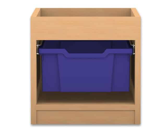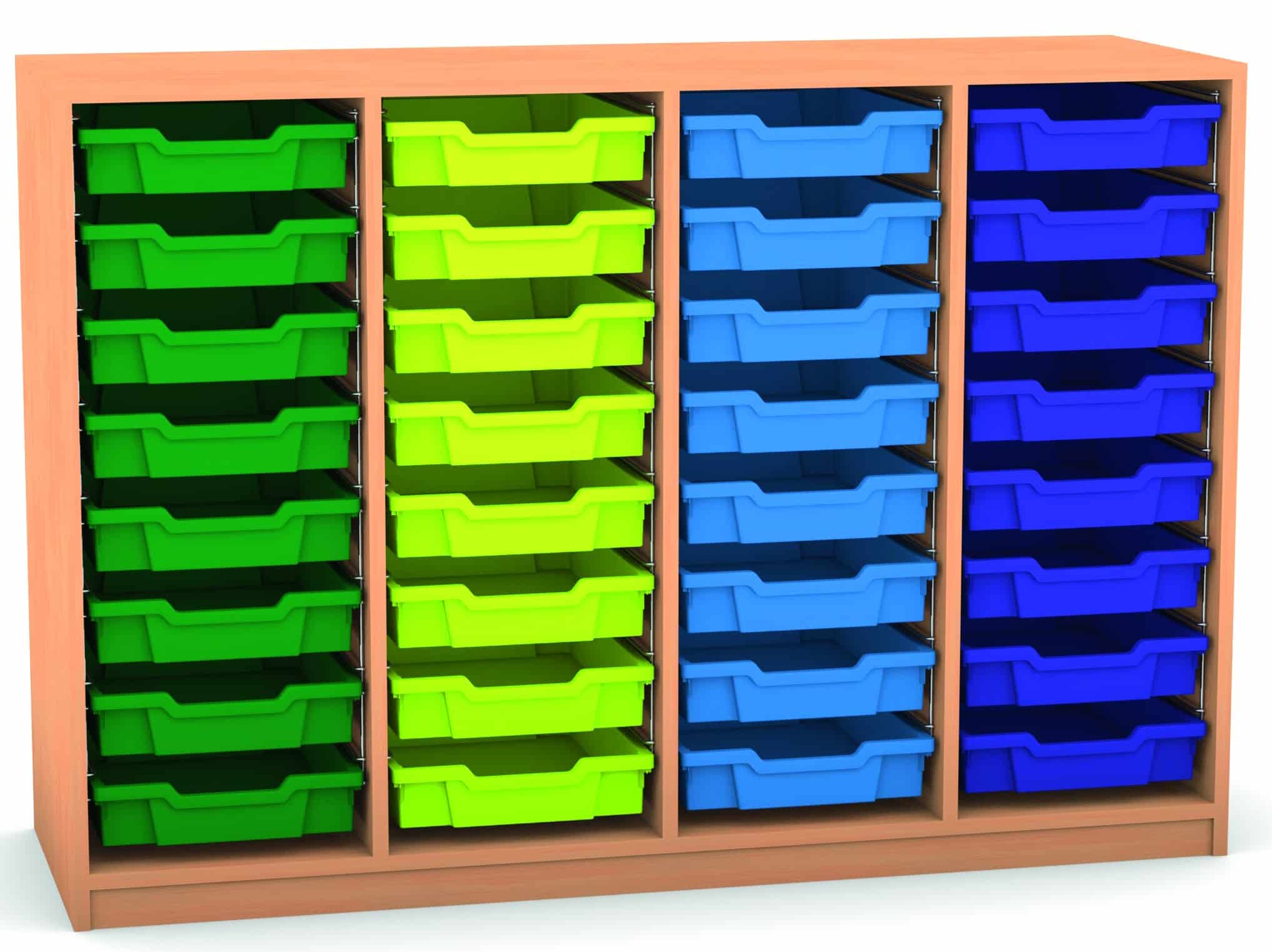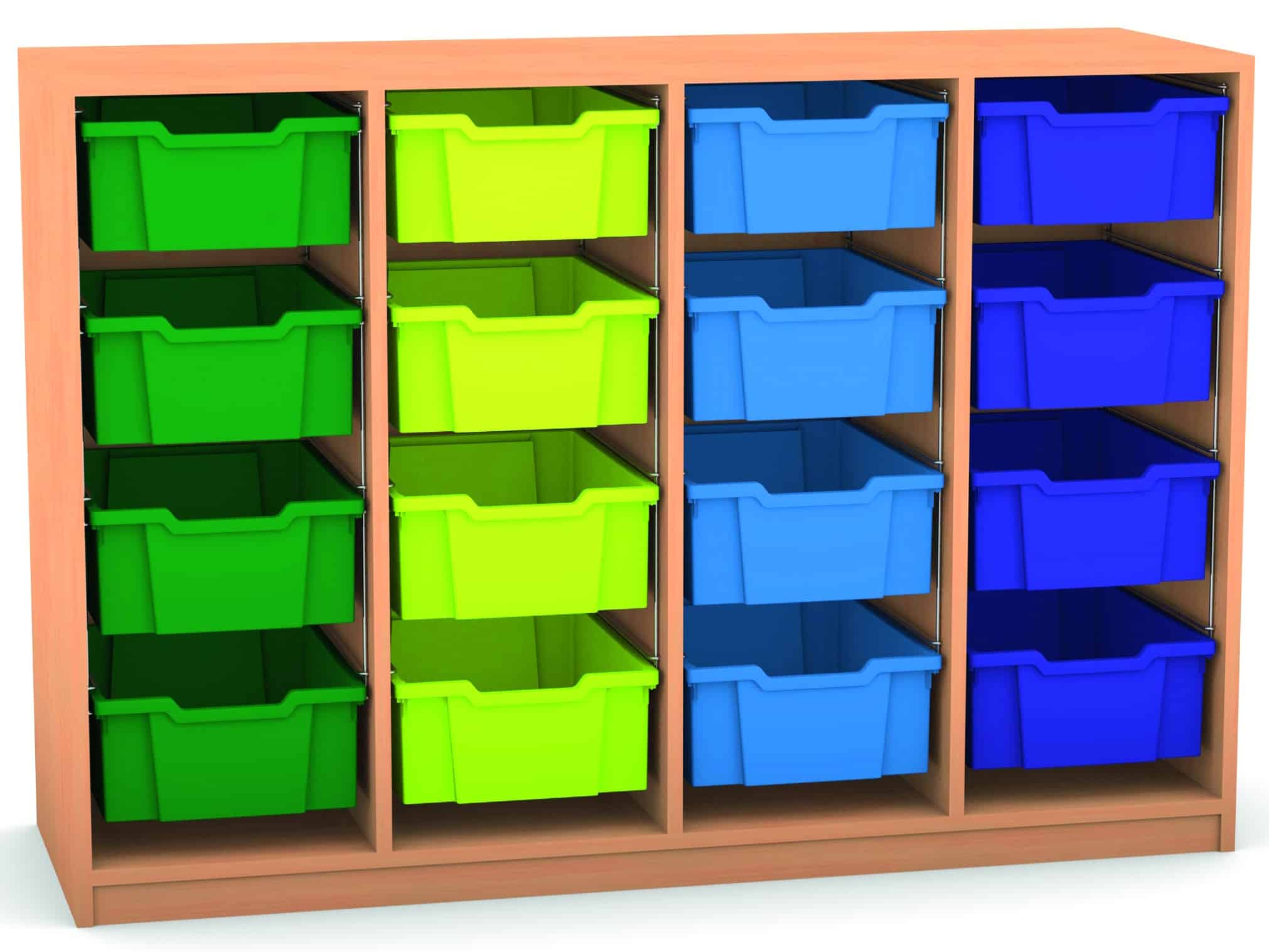 4 rijen, 16 grote (15cm hoog) of 32 kleine (7,5cm hoog) slagvaste kunststof Gratnells laden. H/B/D 99×143,9×48 cm.