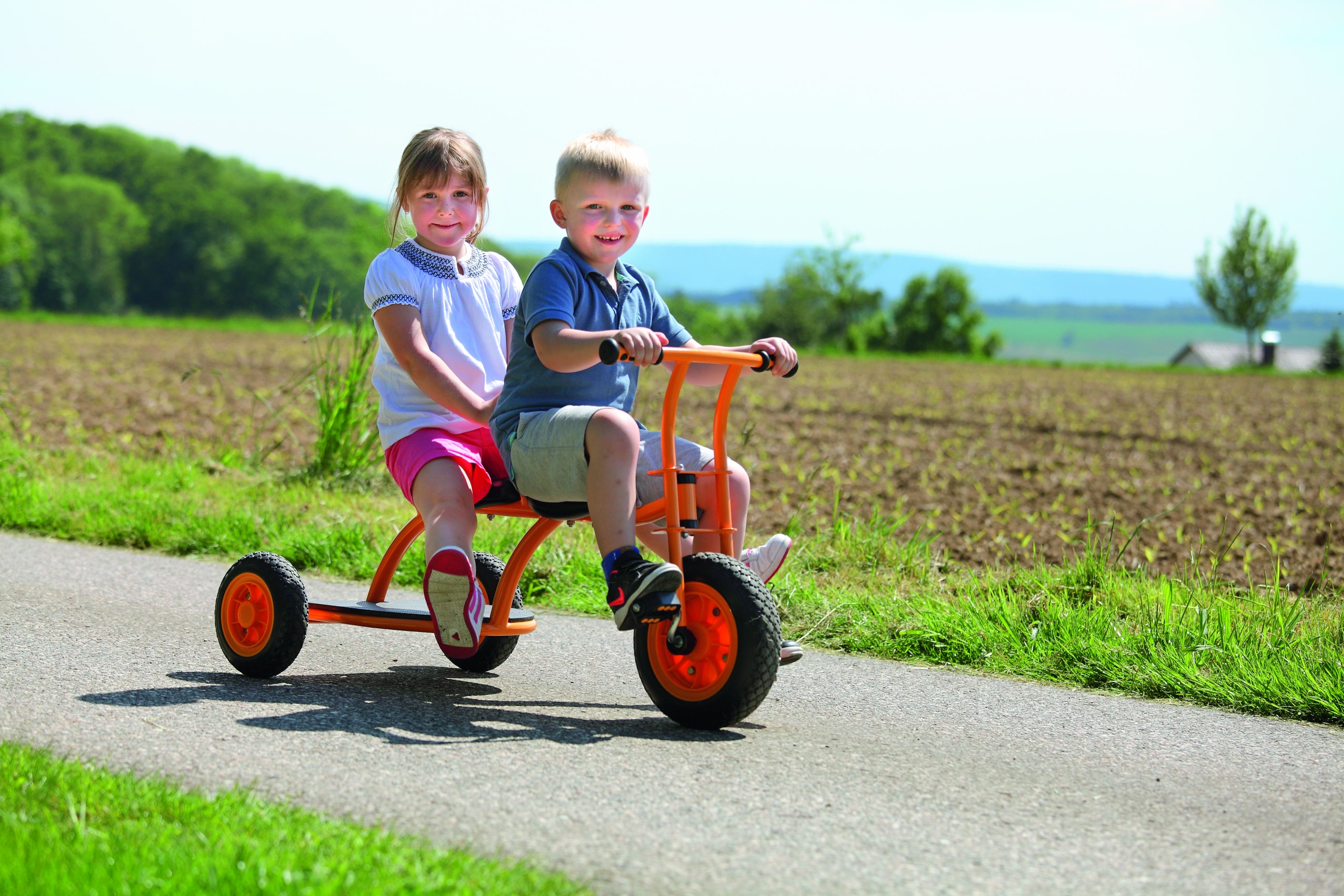 Vanaf nu kan je met deze kindertaxi met twee zitplaatsen overal heen naartoe rijden. Door het voertuig met je benen te verplaatsen wordt de lichaamsbalans en motoriek bevorderd. De chauffeur moet op zijn passagier letten, de passagier moet blijven zitten en zich goed vasthouden. Communicatie en empathie worden hier getraind. De passagier kan zijn voeten comfortabel op de treeplank zetten.