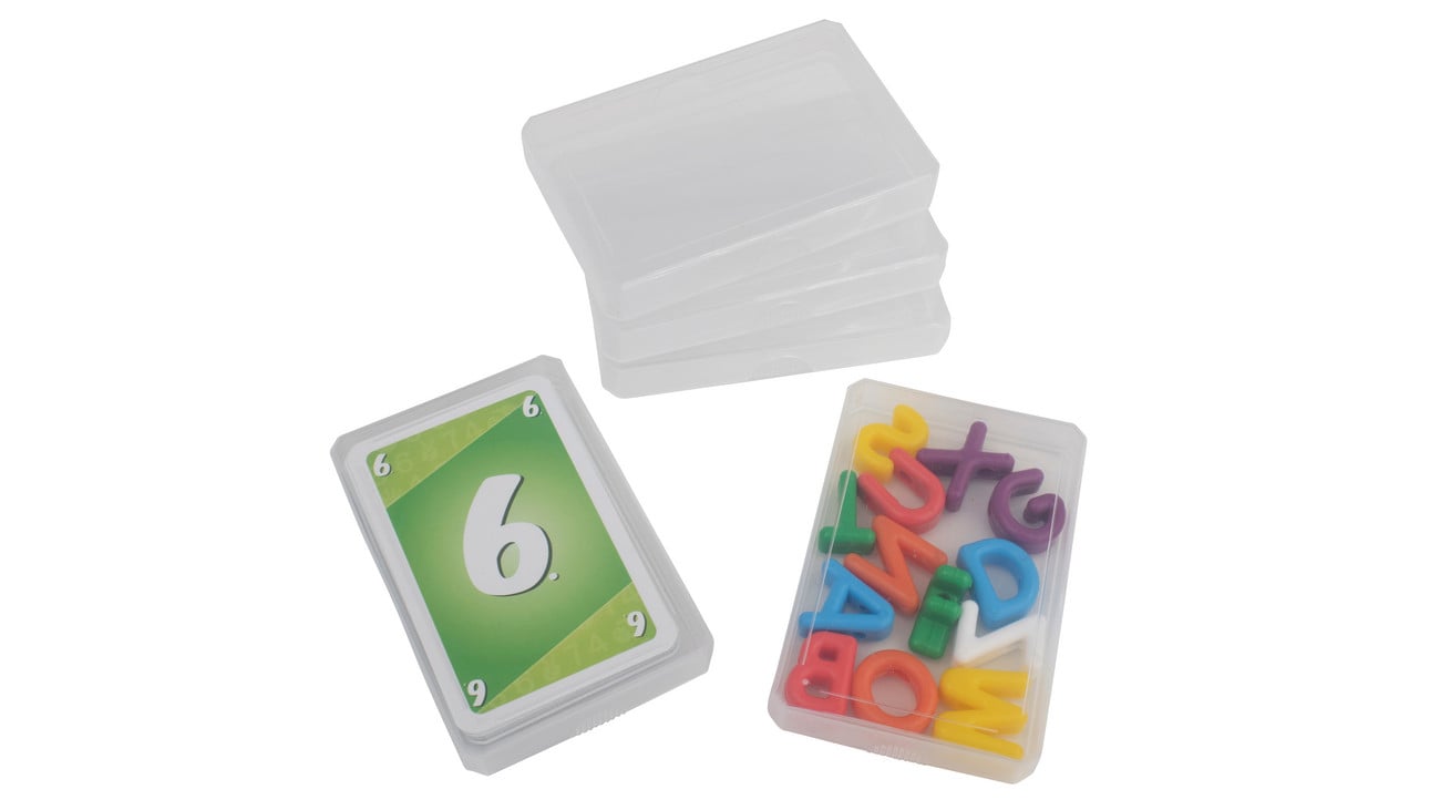 De kaartenboxen zijn niet alleen geschikt voor het opbergen van speelkaarten, maar ook voor spelaccessoires zoals dobbelstenen en speelfiguren. Dankzij het voordeelpack van 5 stuks kunnen ook andere kleine voorwerpen zoals paperclips, elastiekjes of magneten overzichtelijk worden gesorteerd en gemakkelijk worden meegenomen. Wat u er ook in opbergt: door het transparante materiaal is de inhoud altijd direct van buitenaf zichtbaar.