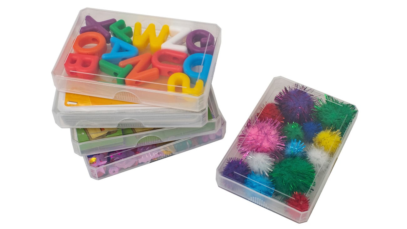 Deze transparante opbergboxenset is ideaal voor het organiseren van les- en knutselmateriaal. De boxen zijn stapelbaar, stevig en voorzien van een veilige kliksluiting. Perfect voor gebruik in klaslokalen, kinderopvang en groepswerk.