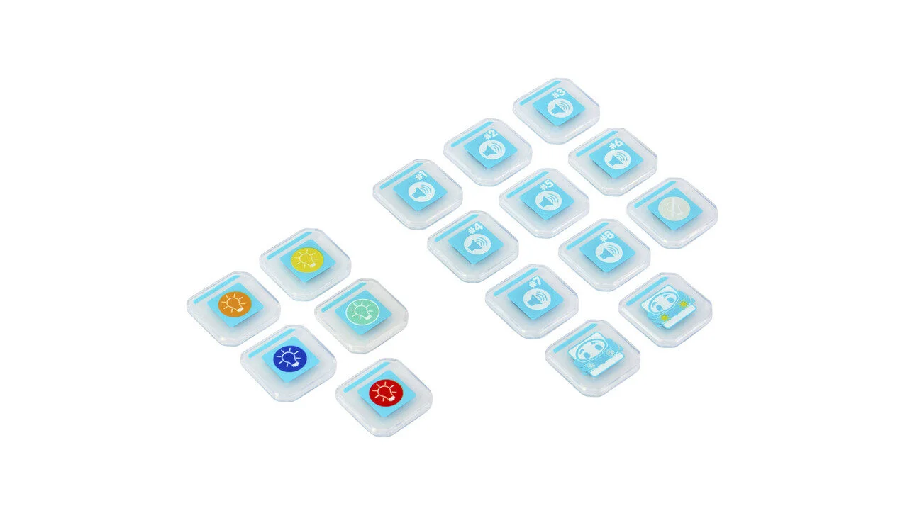 Elk kaartje staat voor een bepaalde functie van de Loti-Bot, bijvoorbeeld het aansturen van de RGB-leds, het afspelen van geluiden of het in- en uitschakelen van de schijnwerpers. Wanneer de kaartjes in de programmeerlijst worden geplaatst, ontstaat er een duidelijke reeks commando’s die de bewegingen van de robot combineren met licht- en geluidseffecten. Nadat op “Start” is gedrukt, voert de Loti-bot de reeks direct uit. Tijdens de uitvoering lichten de tegels op en geven ze aan welke stap op dat moment actief is. Zo zien kinderen meteen hoe de commando’s worden uitgevoerd, kunnen ze fouten gemakkelijker vinden en hun programma gericht verbeteren.