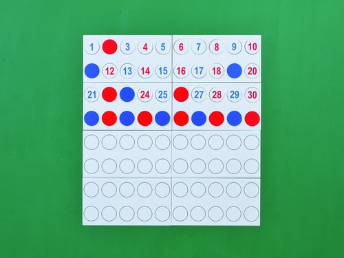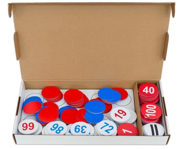 100x omkeerbare tegels met rode cijfers 1 – 100 aan de ene kant en blauwe cijfers 1 – 100 aan de andere kant