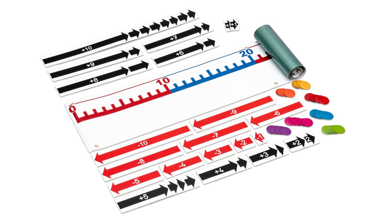 Met de magnetische getallenlijn kunnen leerlingen overzichtelijke rekenopgaven maken. De getallenlijn kan direct op de klasmuur worden gemonteerd met het bijgeleverde bevestigingsmateriaal. De magnetische getallenlijn biedt een breed scala aan toepassingen, zoals het markeren van bepaalde nummers met gekleurde magneten. De grote rekenpijlen worden gebruikt om rekenmethoden en -strategieën weer te geven. Daarnaast zijn de pijlen aan beide zijden bedrukt, zodat de zwarte plus- en rode minpijlen optimaal gebruikt kunnen worden voor optel- en aftrektaken. De pluspijlen wijzen naar 100, de minpijlen naar 0. De getallenlijn kan ook individueel met symbolen en cijfers worden gelabeld met whiteboardstiften. De belettering kan later eenvoudig weer worden weggeveegd.