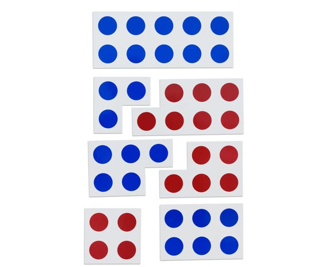 De set bestaat uit drie 5-plaatjes en elk ÊÊn plaatje van 1 t/m 4 en 5 t/m 10. Dit betekent dat alle delingen van het getal 10 en alle getalsoptellingen mogelijk zijn.