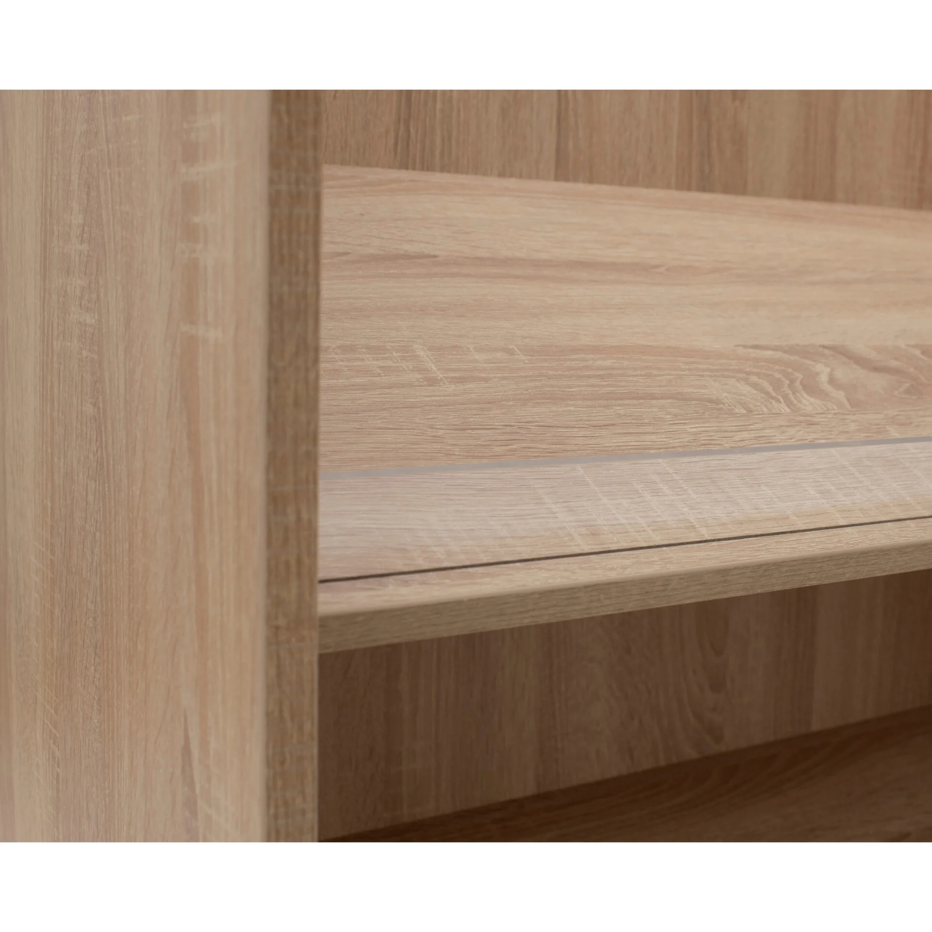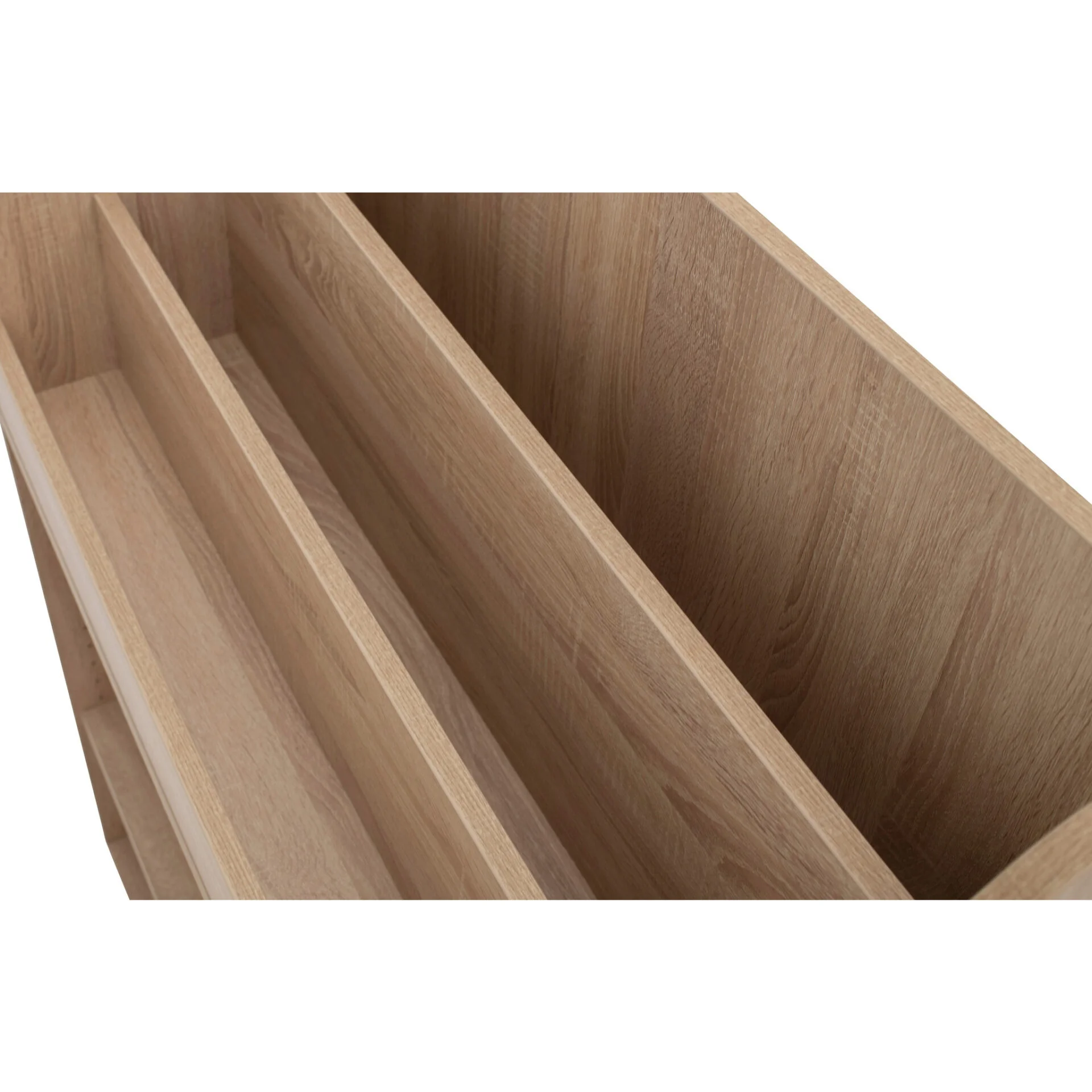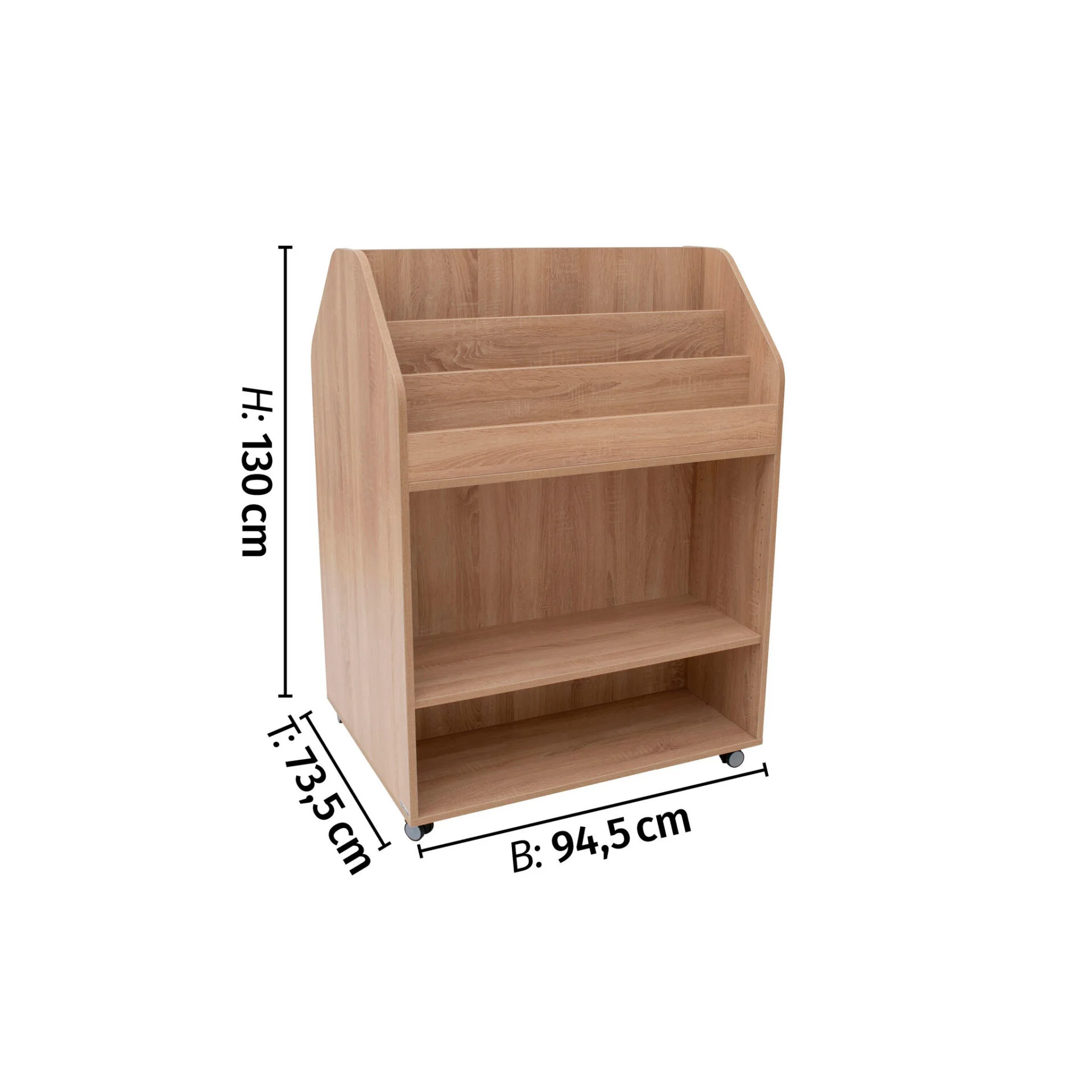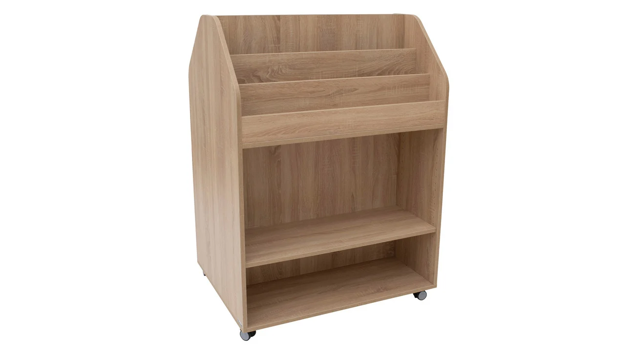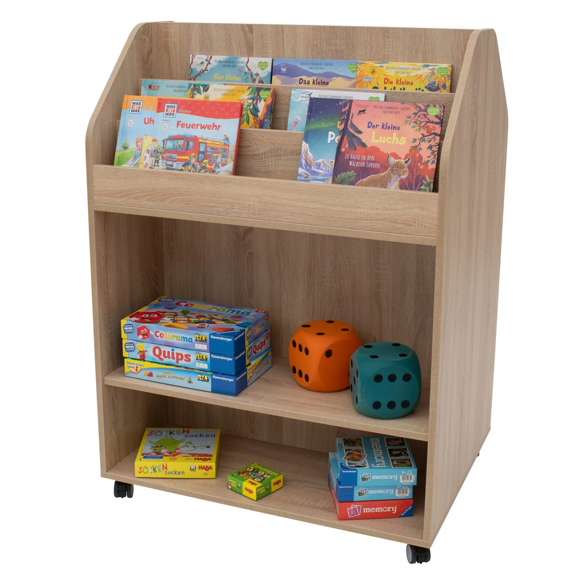Zelfs de allerkleinsten kunnen gebruikmaken van de twee onderste planken, waar ook speelgoed of andere spullen kunnen worden opgeborgen. Het leesmateriaal voor de grotere kinderen kan in de bovenste trapvormige vakken worden geplaatst. De achterkant biedt nog meer opbergruimte met schuine vakken.