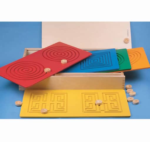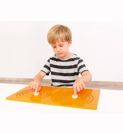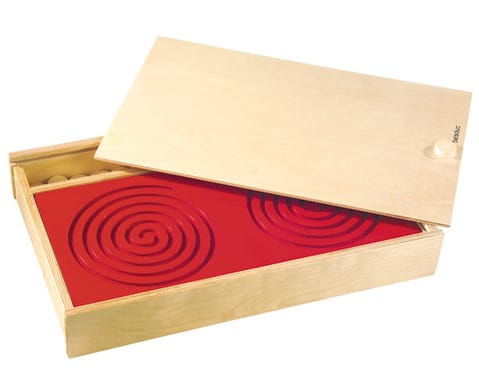 5 motorische tandemborden met verschillende motieven in houten opbergkist met 10 schuif schijfjes, bevordert motorische vaardigheden door gespiegelde figuren. Beide hersenhelften worden tegelijk geactiveerd en met elkaar verbonden door de symmetrie van beide handen. Bevordert de basisvaardigheid voor de schrijfmotoriek, oog-hand coördinatie en de concentratie.