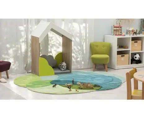Dit grote, organisch gevormde vloerkleed maakt indruk met zijn harmonieuze kleurenschema in zachte groen- en blauwtinten. Met zijn knusse, zachte pool van robuuste, gedraaide nylon lussen is het de ideale speelplek voor kinderopvang en groepsruimtes. De vloeiende, abstracte vormen bieden talloze speelmogelijkheden: dieren kunnen “grazen” op de groene vlakken en bootjes kunnen “drijven” op de blauwe vlakken. Zitten, liggen, bouwen of verhalen vertellen – dit tapijt creëert een gezellige sfeer en nodigt kinderen uit om te ontdekken en te spelen.