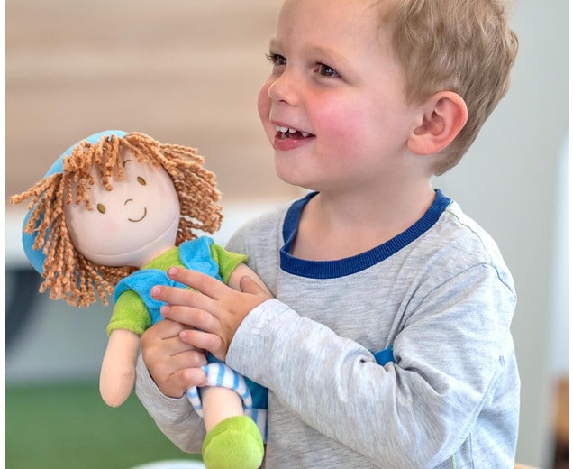 Pop Silas. Zachte pop met vriendelijke uitstraling, ideaal voor rollenspel en sociale ontwikkeling.