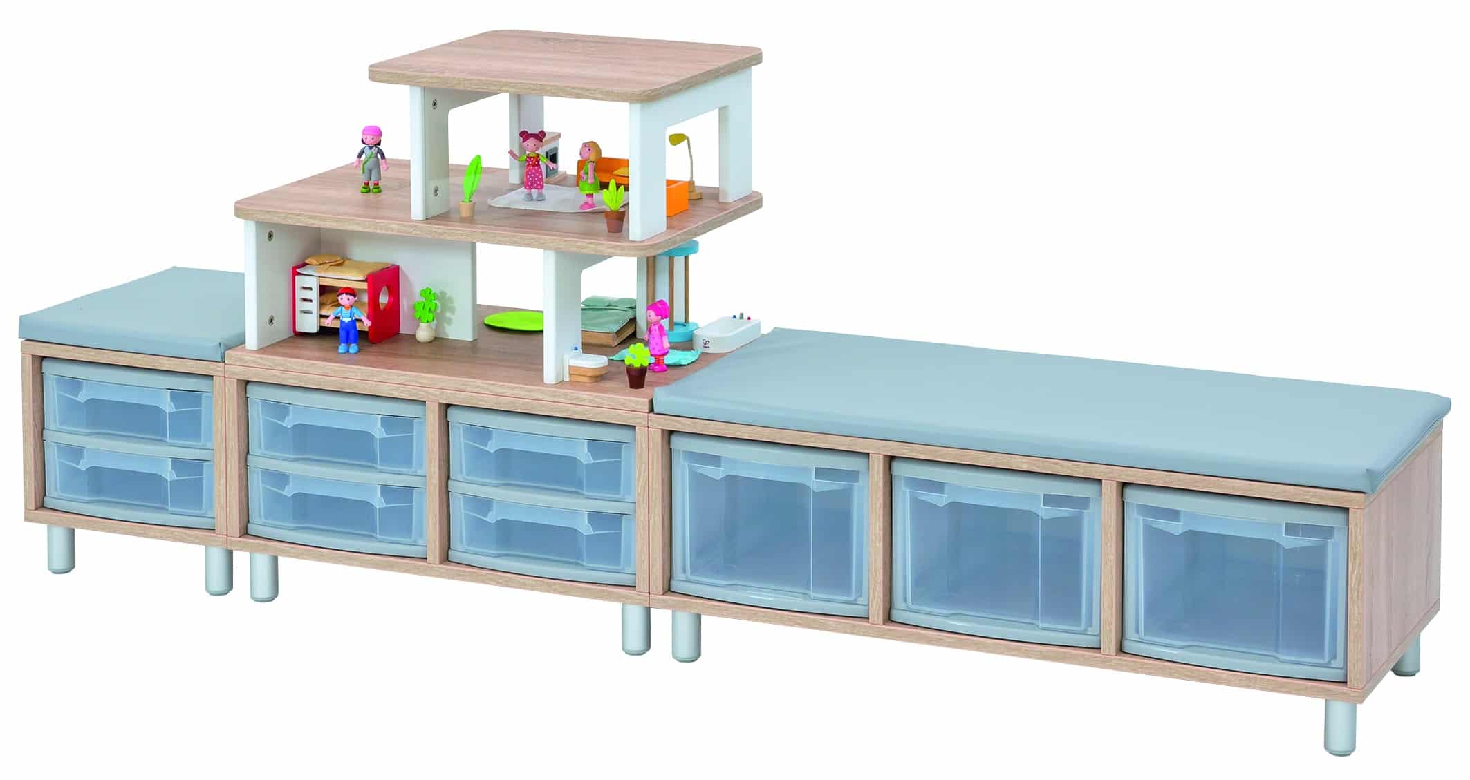 Prachtig poppenhuis in decor Eiken/Wit H/B/D 43,7x66x40cm met groot acryl glas raam. Op de 2 etages kan de poppen familie wonen, het huis past exact op het Educasa kast systeem met 2 rijen. Eenvoudig zelf te monteren, levering zonder kast en decoratie.
