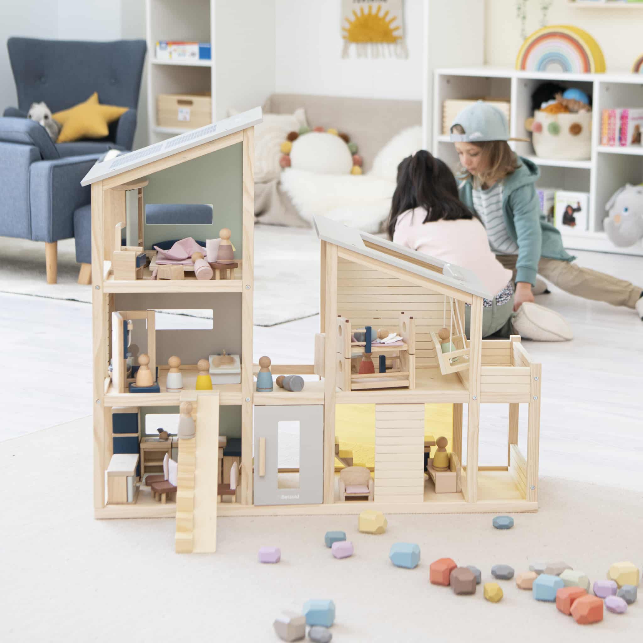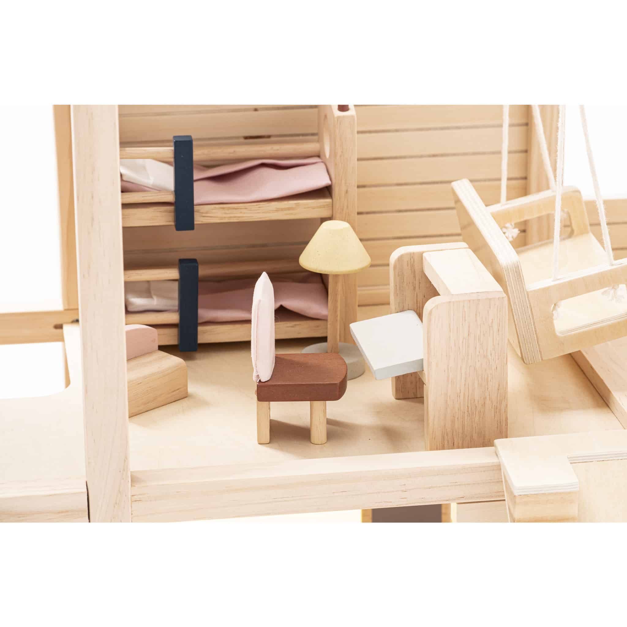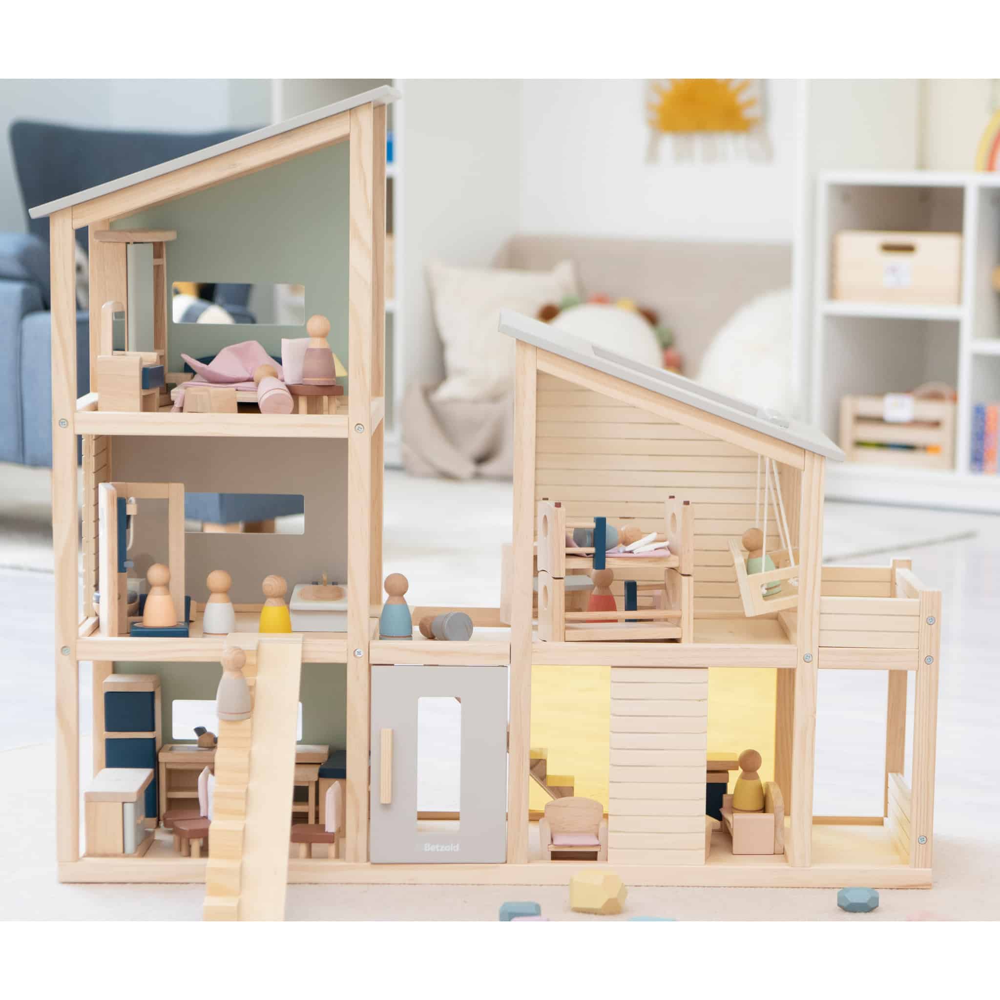 De kinderen kunnen hun speelhuis met 3 verdiepingen flexibel inrichten met poppenmeubels, afhankelijk van de verhalen die in hen opkomen. Individuele muurelementen kunnen bijvoorbeeld worden verplaatst en de trap kan door de kinderen op verschillende plaatsen worden neergezet. De mooie brede schommel kan naar eigen inzicht op verschillende plaatsen worden opgehangen, bijvoorbeeld op het balkon.