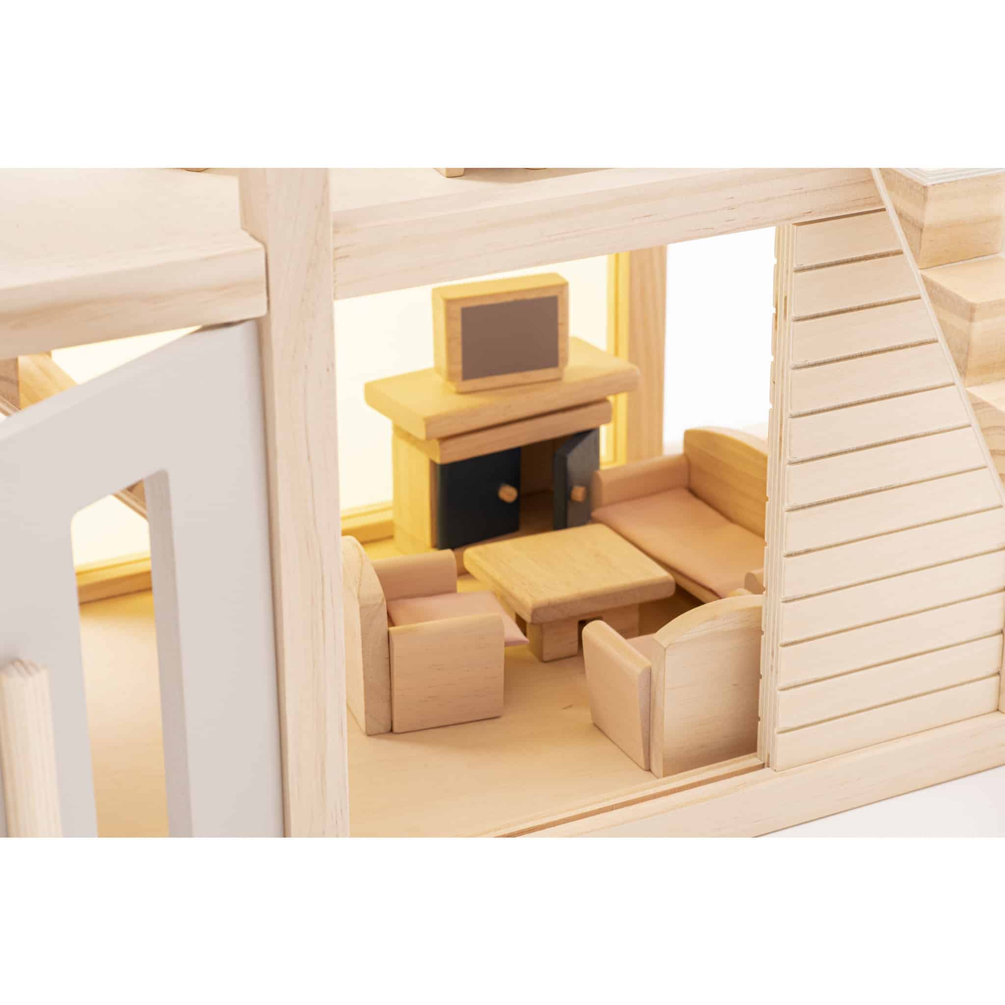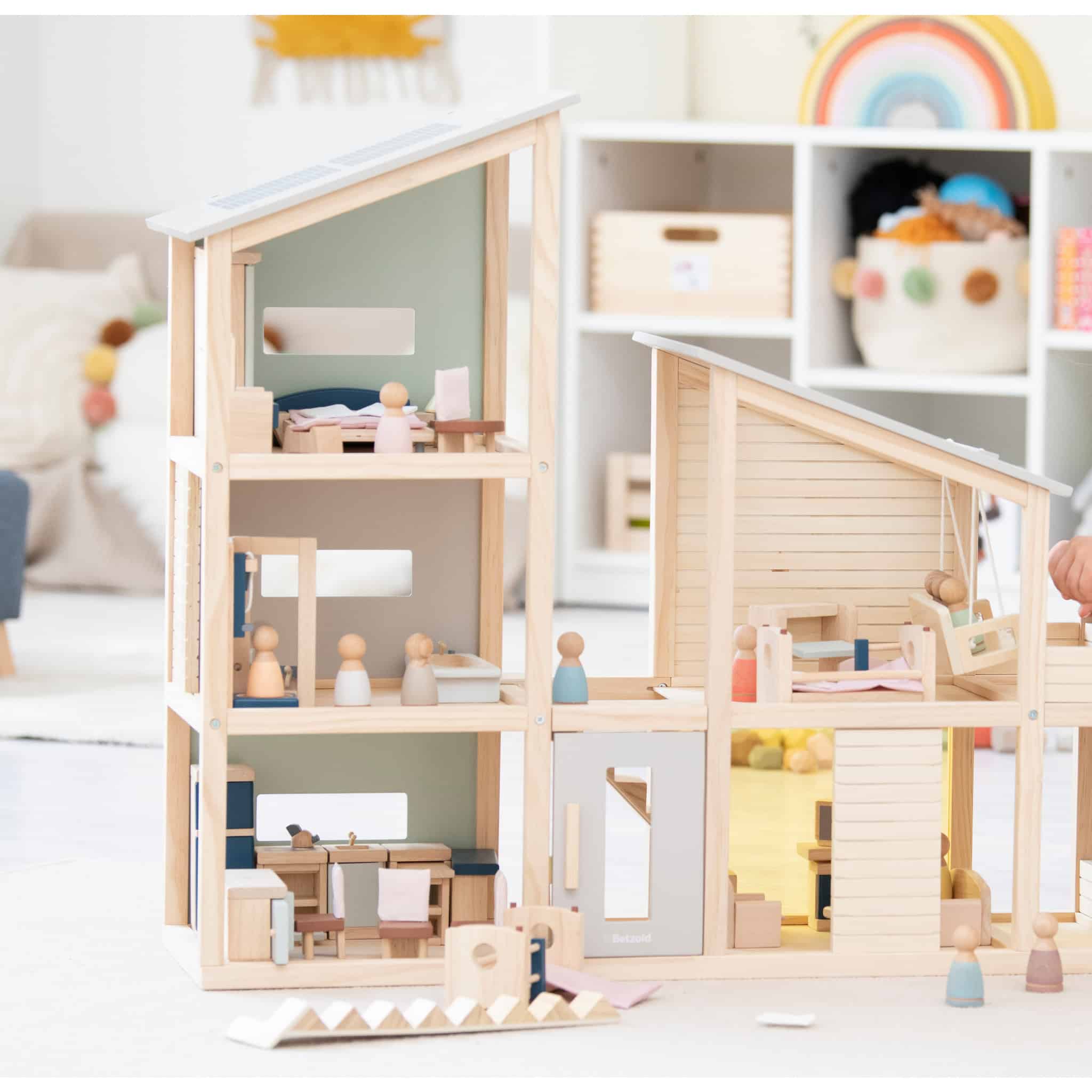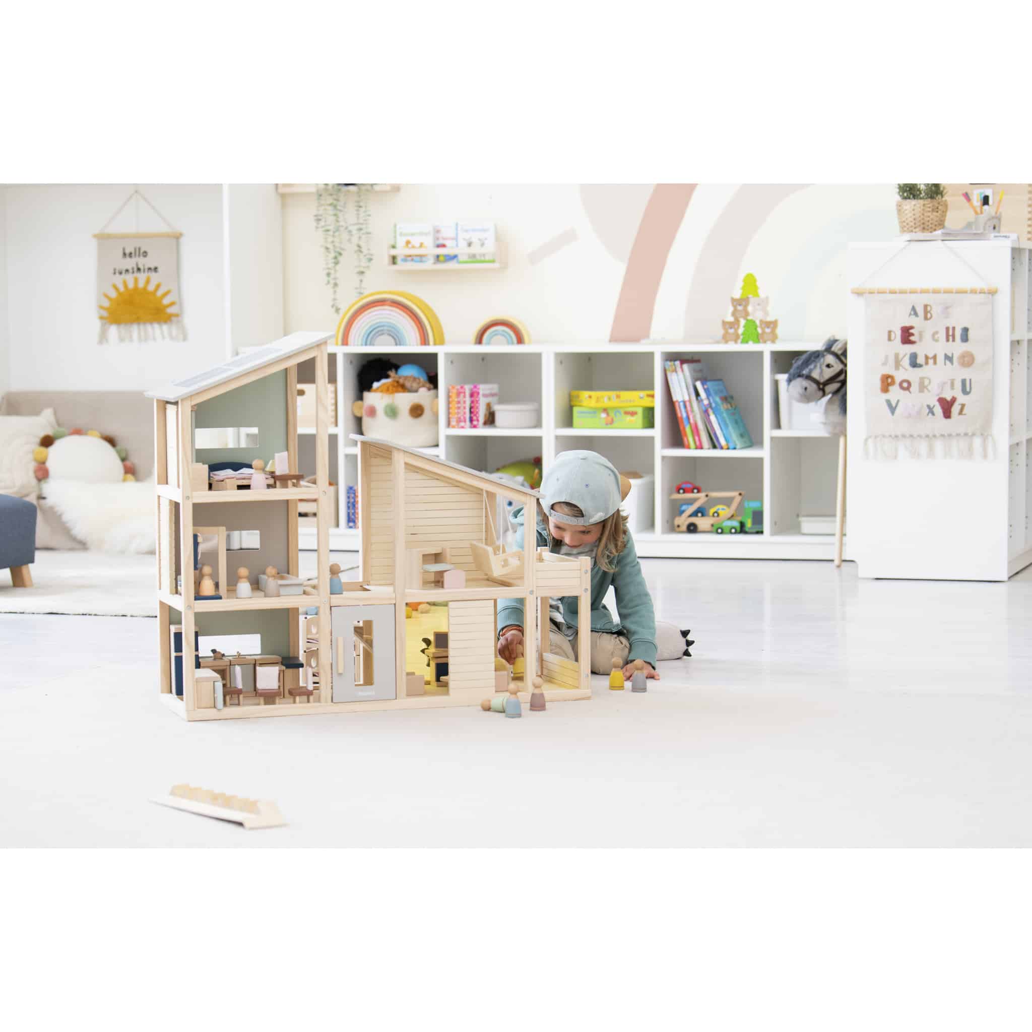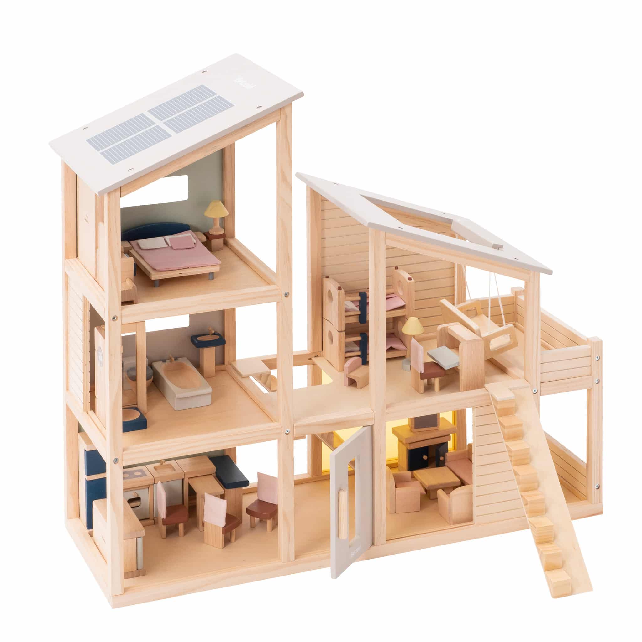 Dit mooie houten poppenhuis in neutrale kleuren is uitnodigend en licht. De muren zijn in moderne kleuren (mintgroen, lichtgrijs). Ook de trendy houten paneellook is inbegrepen. Aan de achterkant zorgt een gele acrylruit ervoor dat helder daglicht het huis binnenkomt, net als zonlicht. Hierdoor zien de kamers er veel gezelliger uit. De kleine garage en de nagebouwde zonnepanelen op het dak maken de speelervaring compleet. Kinderen kunnen spelenderwijs de energievoorziening nabootsen.