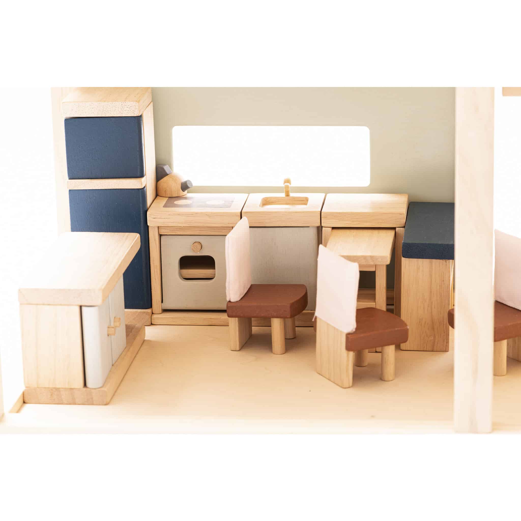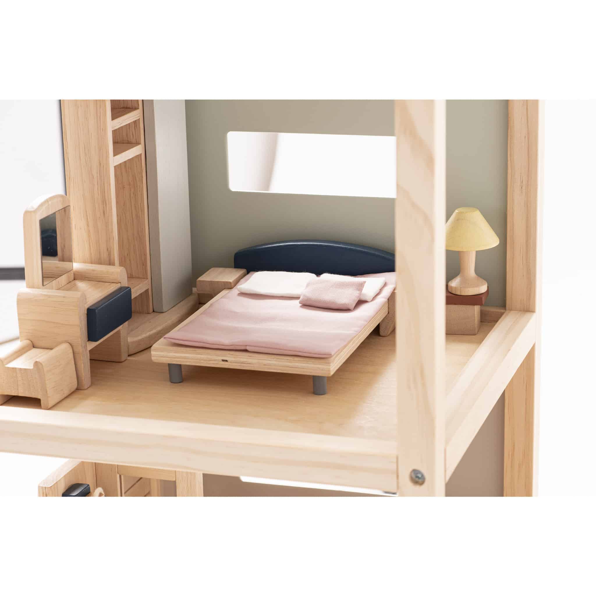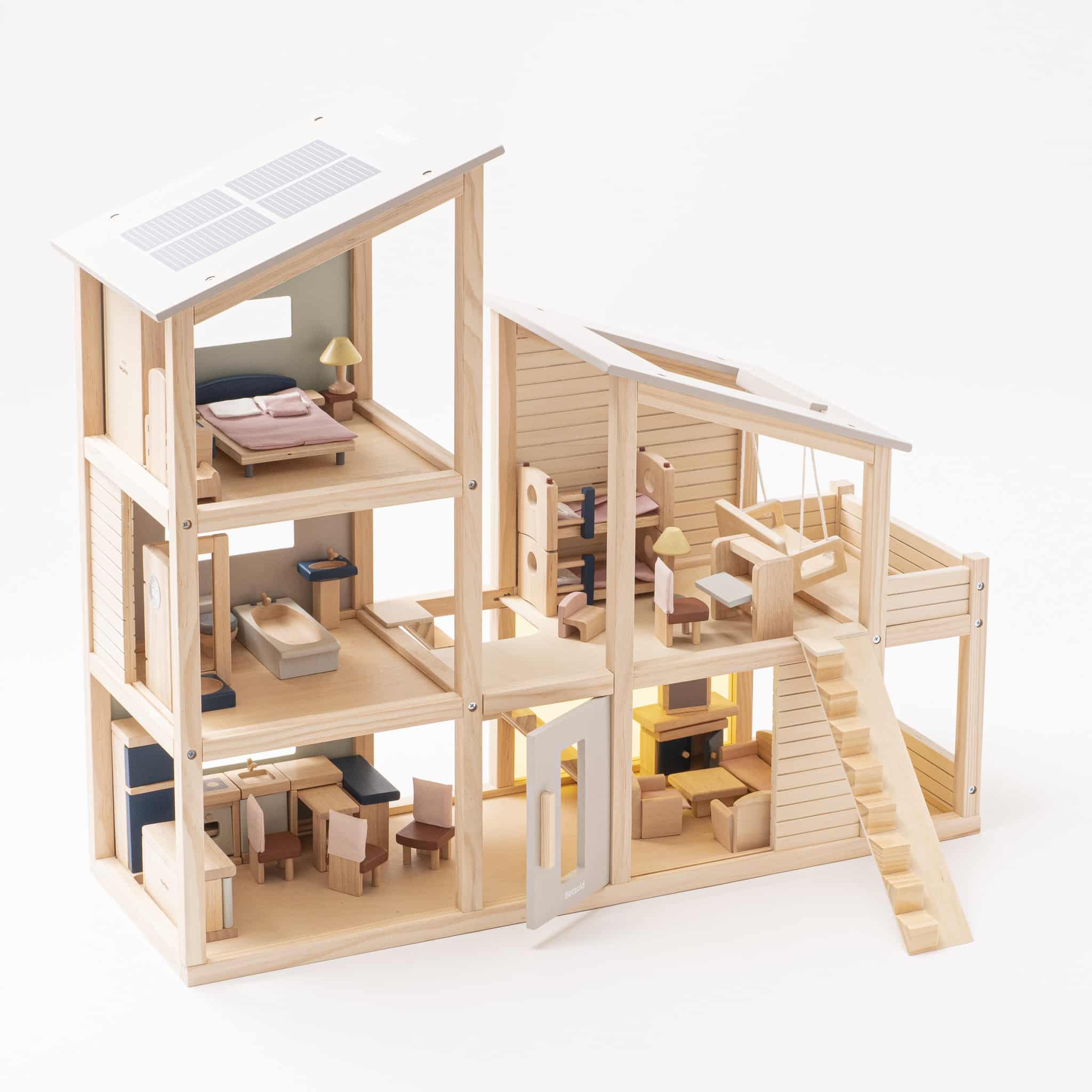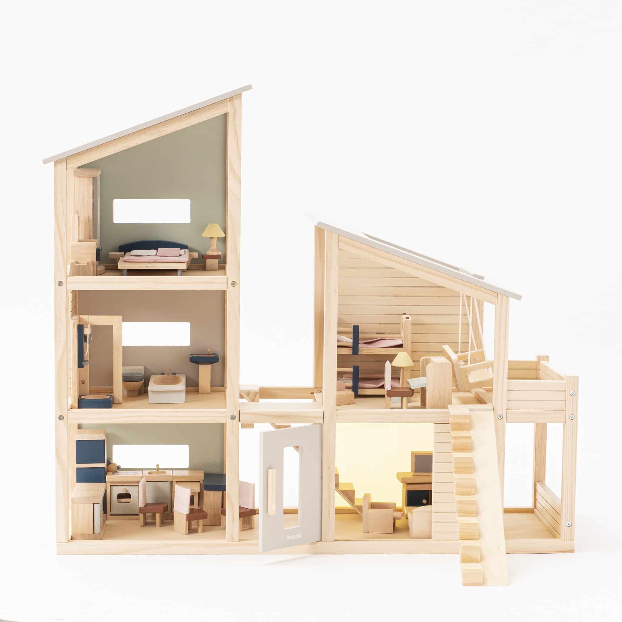 Dit mooie houten poppenhuis in neutrale kleuren is uitnodigend en licht. De muren zijn in moderne kleuren (mintgroen, lichtgrijs). Ook de trendy houten paneellook is inbegrepen. Aan de achterkant zorgt een gele acrylruit ervoor dat helder daglicht het huis binnenkomt, net als zonlicht. Hierdoor zien de kamers er veel gezelliger uit. De kleine garage en de nagebouwde zonnepanelen op het dak maken de speelervaring compleet. Kinderen kunnen spelenderwijs de energievoorziening nabootsen.