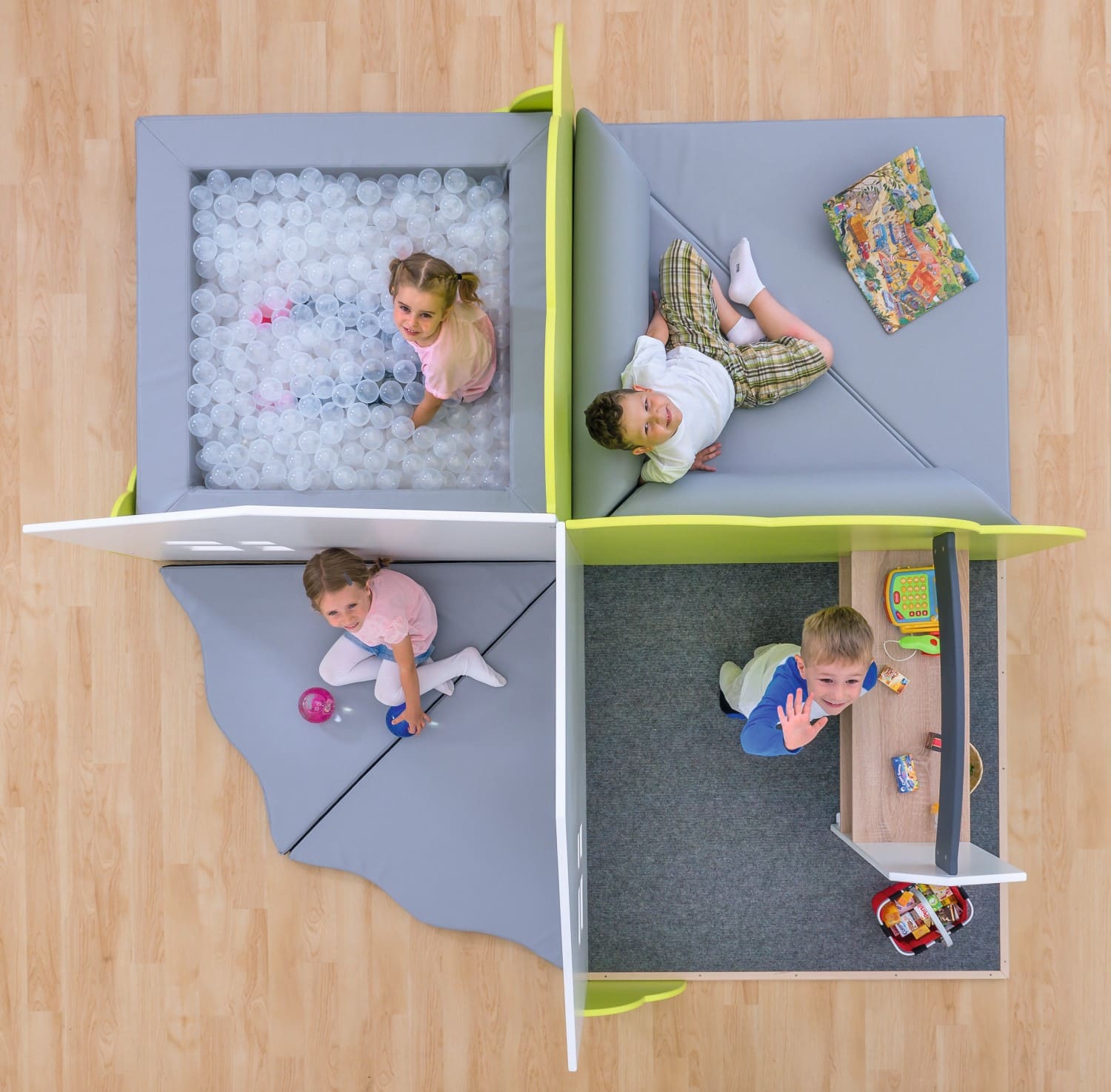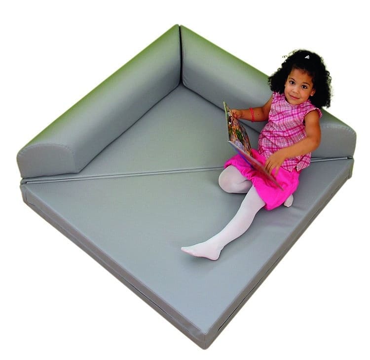 Opklapbare driehoek met ruggensteun, H/B/D 35x118x118cm passend in de speelhoeken. Materiaal eenvoudig te reinigen kunstleder, uiteraard brandvertragend naar DIN EN 1021. Kern bestaat uit schuimstof (PU).