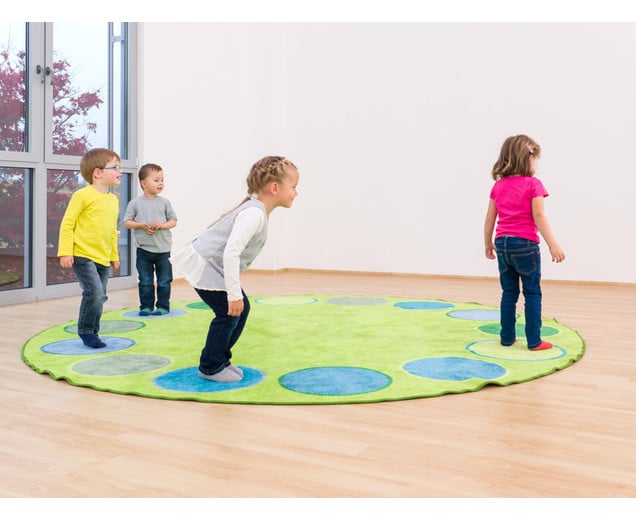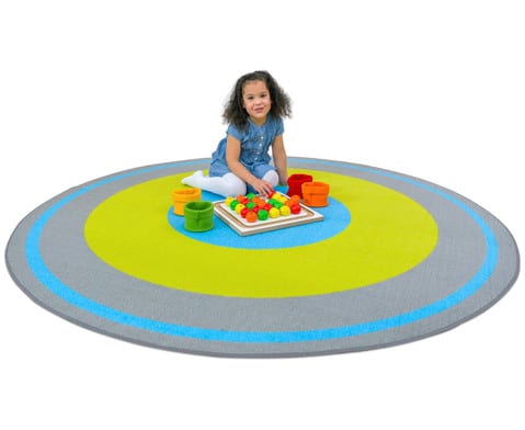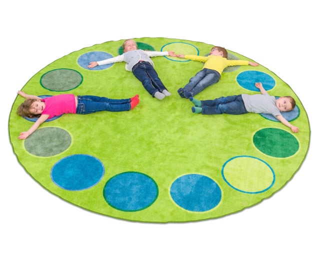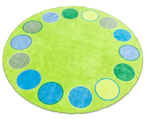 Fantastisch mooi zitcirkeltapijt met in totaal 14 zitplaatsen, die symbool staan voor “Hier zit ik!”. Dit zorgt voor gestructureerd in een kring zitten , geeft de kinderen geborgenheid, bevordert de groepsdynamiek en biedt daarnaast goed oogcontact zowel met elkaar als met de begeleider(s). Op deze manier worden ochtendkringactiviteiten, spannende vertelsessies of groepswerk prachtige gemeenschapservaringen. Gebouwen gemaakt van bouwstenen, legpuzzels of andere kleine spellen werken heel goed op het tapijt met zijn extra dunne pool. Door de harmonieuze kleurstelling in zachte groen- en blauwtinten is het de blikvanger in de ruimte en gaat het perfect op in de omgeving en heeft ook een natuurlijk en rustgevend effect op de kinderen.
