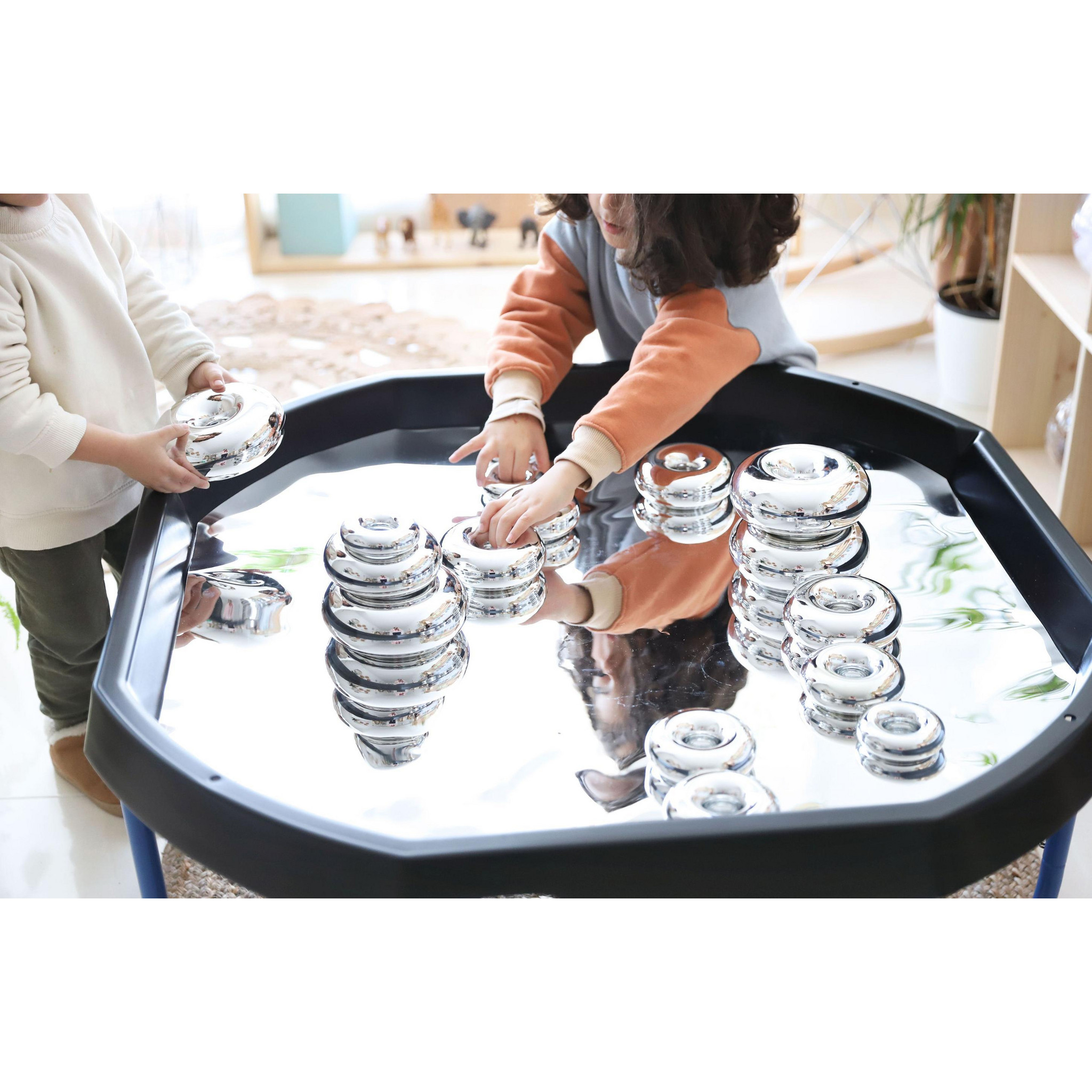 Ontdek spannende weerspiegelingen op ooghoogte. Kinderen kunnen hun eigen spiegelbeeld en reflecties ontdekken met de spiegelinleg die bij je onderzoeksbak past. De spiegelinleg is ideaal als basis voor verschillende materialen. Het spiegeleffect wordt nog eens extra versterkt indien je met spiegelmateriaal speelt en motiveert kinderen om verschillende mogelijkheden te blijven uitproberen.