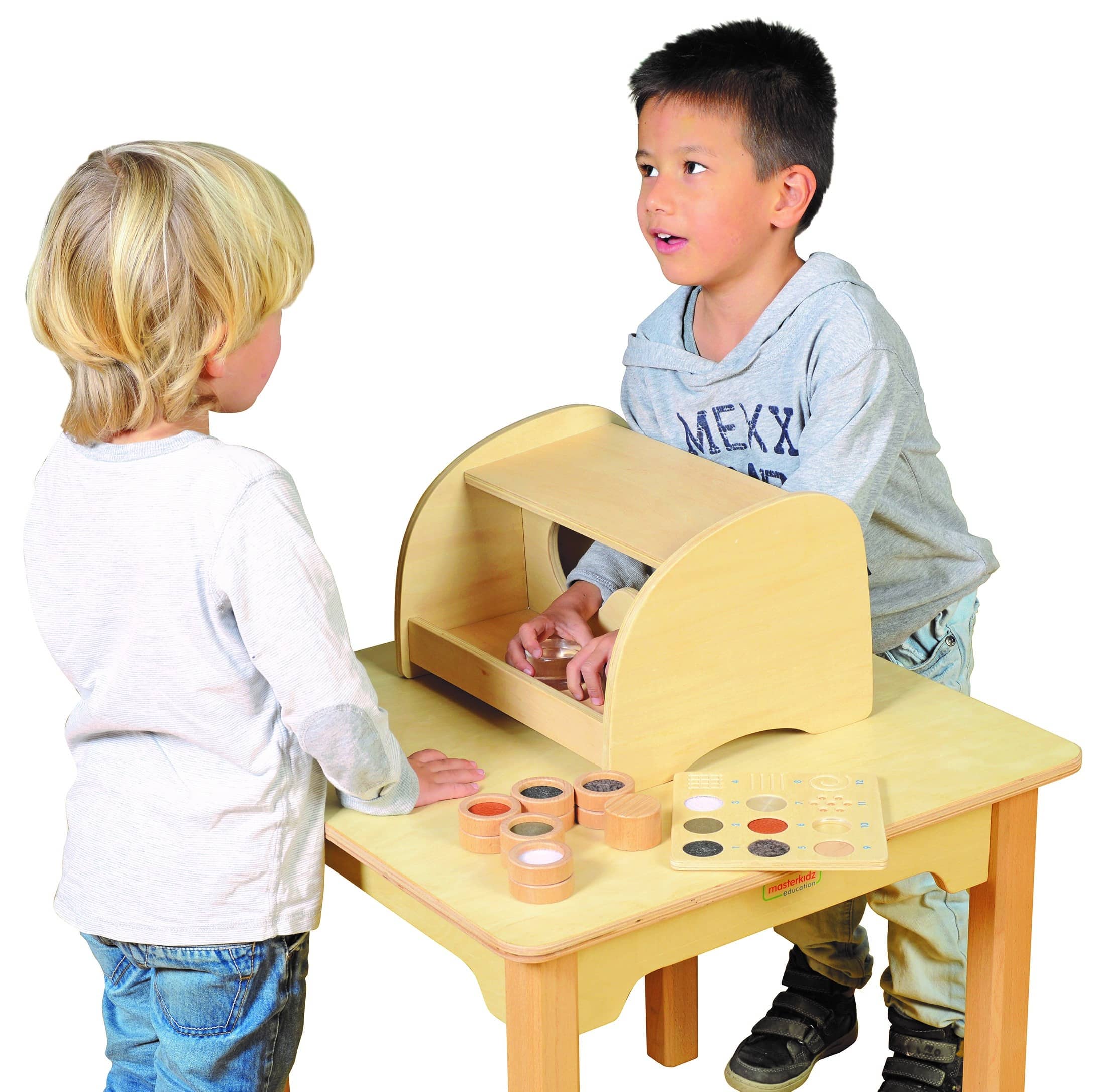 Robuuste voelkast met 2 gaten voor de armen, voel de grootte, vorm, gewicht, structuur, woordenschat en communicatie.