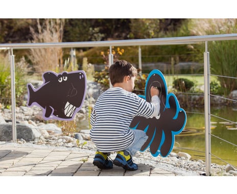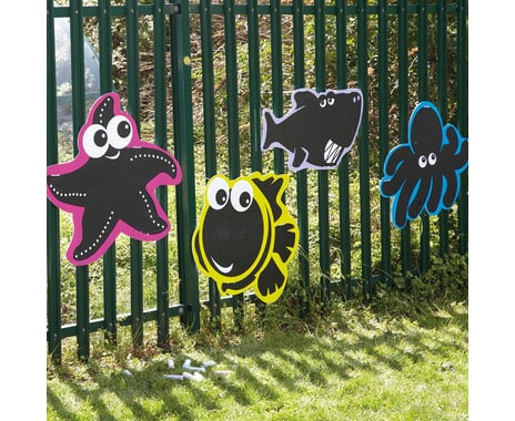 Voor schilderen en kleuren op ooghoogte, deze vrolijke 5-dlg set verandert elk buitenhek in een artistieke zone. Met de meegeleverde kabelbinders zijn deze buitenborden in 5 vrolijke zeedier motieven in een handomdraai op de gewenste plek te bevestigen. Nu kunnen de kinderen hun creativiteit de vrije loop laten met krijt(stift) of vingerverf. De panelen kunnen ook worden gebruikt om bepaalde gebieden op het buitenplein effectief te markeren.