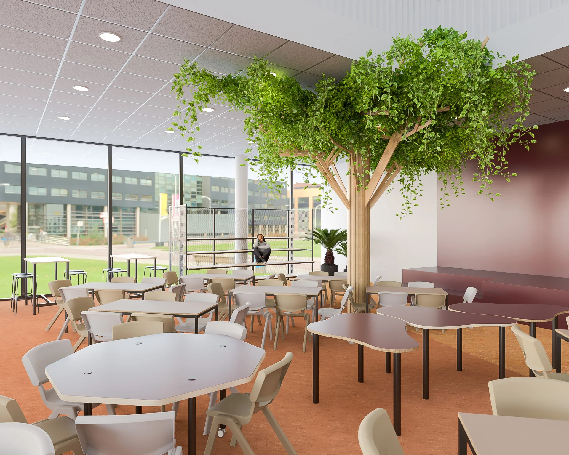 In de aula van het SGDC te Den Haag komt een fantastische maatwerk kunstboom welke de vide in lijkt te groeien! In slechts 6 weken tijd (zelfs met de kerstvakantie er tussen) hebben we voor de open dag een complete metamorfose gecreƫerd door middel van een nieuwe aula inrichting van dit leerplein.