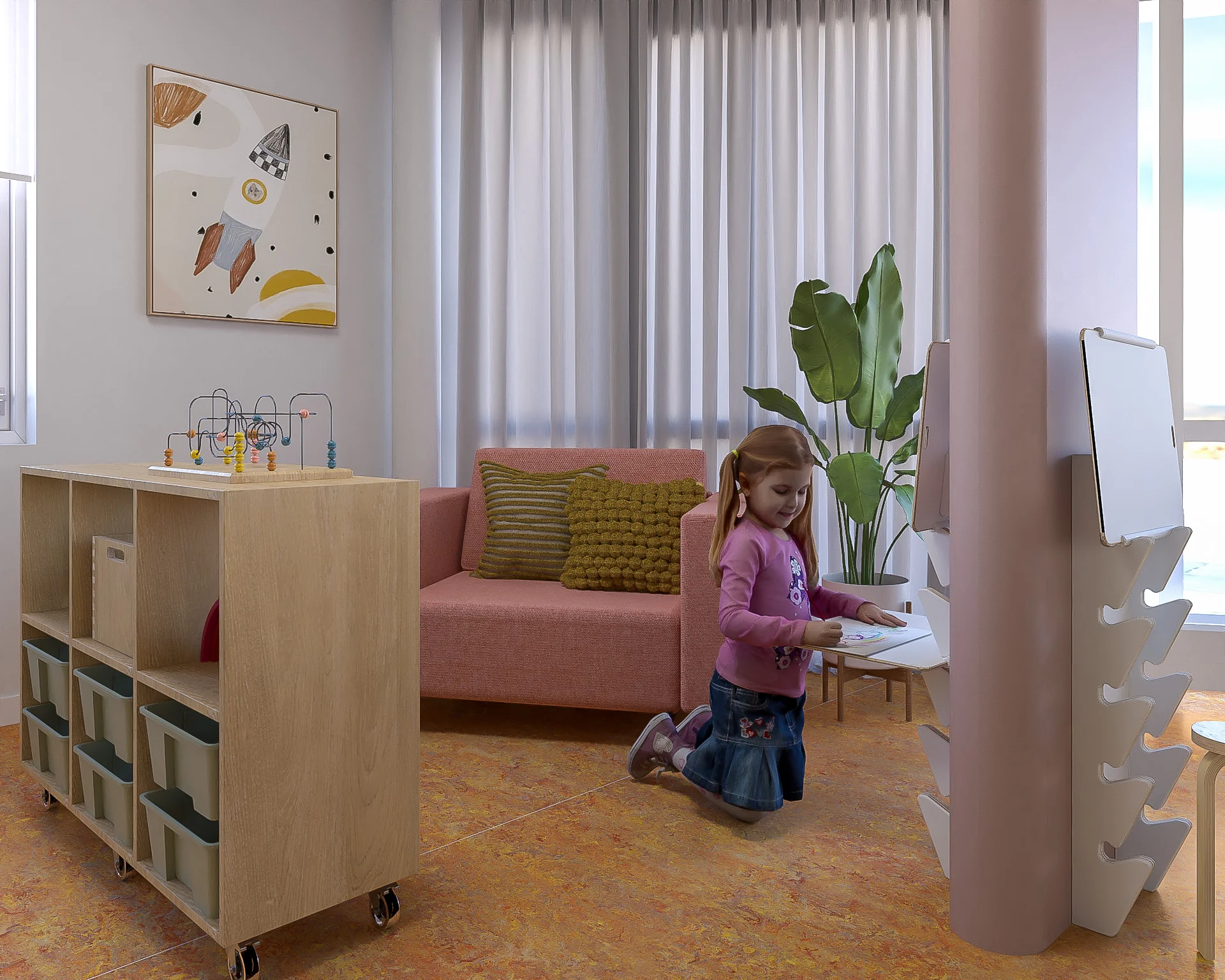 Het rustige kleurenpallet is afgestemd op de vloer welke een vast gegeven was, vooral een welkome ruimte war je ouders te woord kunt staan en waar kinderen samen spelen of zich terug trekken in diverse rustige hoeken moest mogelijk zijn. De 2 aanwezige palen hebben we functie gegeven door een bartafel te maken en 1 paal hebben we voorzien van een ANY wandboom waardoor ieder kind op zijn/haar hoogte naar wens kan gaan staan of zitten met het ANY whiteboard.