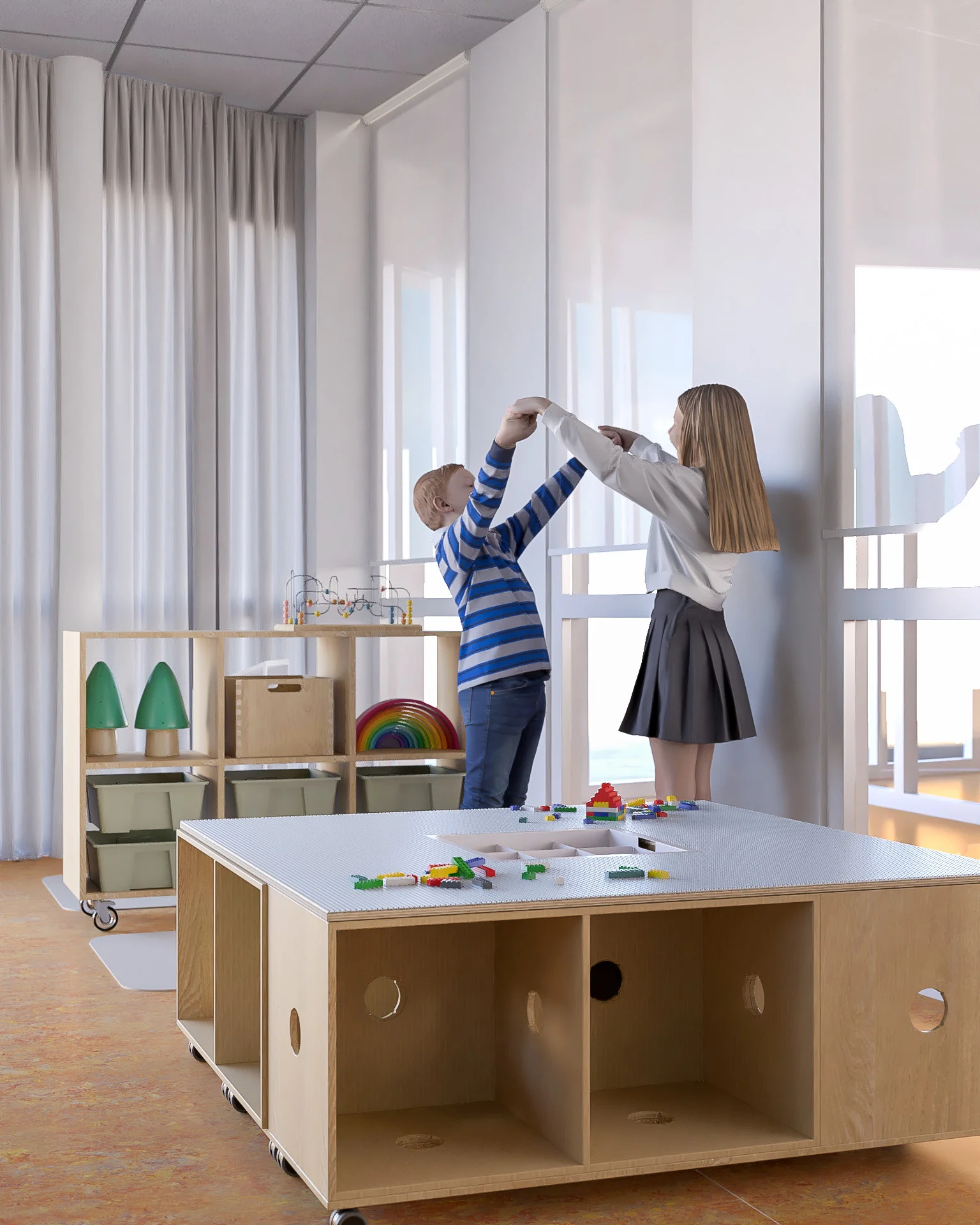 Met onze nieuwe ACTIVE legotafel en duurzame FSC berken houten Deense meubellijn welke het pedagogisch concept van Reggio omarmt hebben we een rustige basis gecreëerd. Door de combinatie van maatwerk, organisch gevormde vrije vorm tafels en standaard artikelen zijn we voor de klant mooi binnen budget gebleven.
