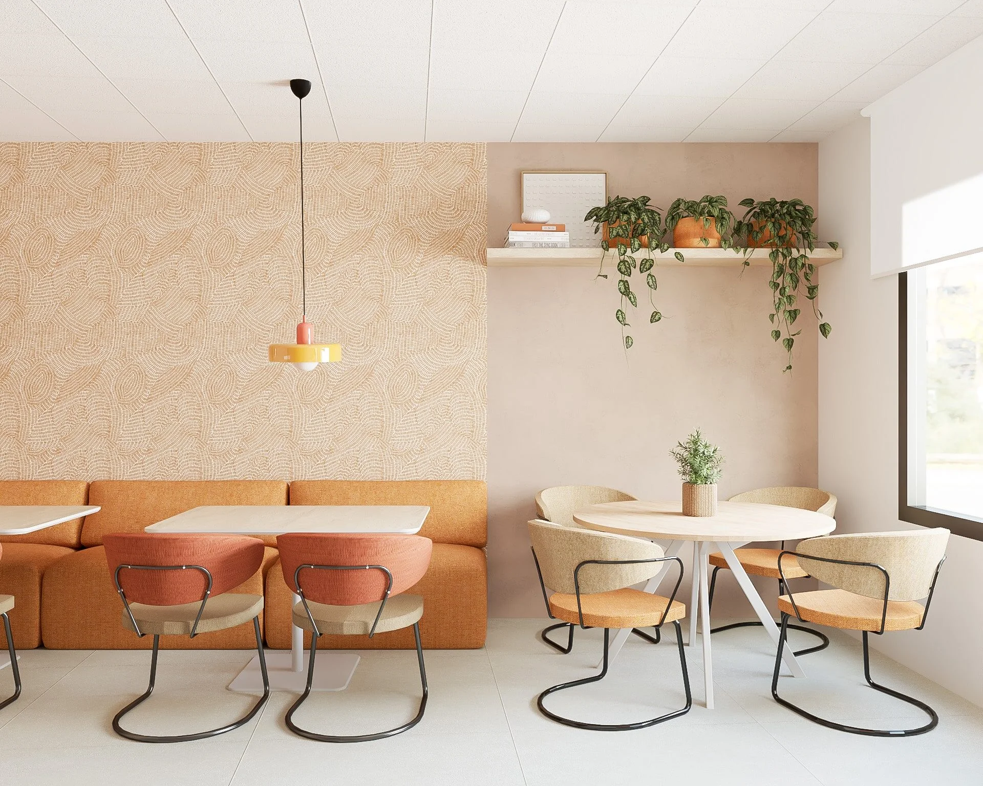 De mooie terra kleuren en aardse tinten van de stoelen en de treinbanken combineren goed met de wand, het groen maakt de ruimte helemaal af.